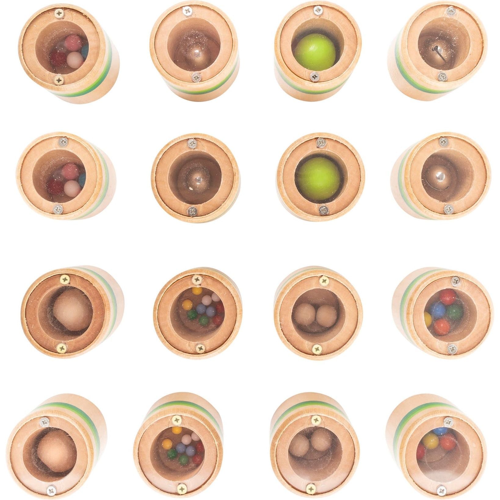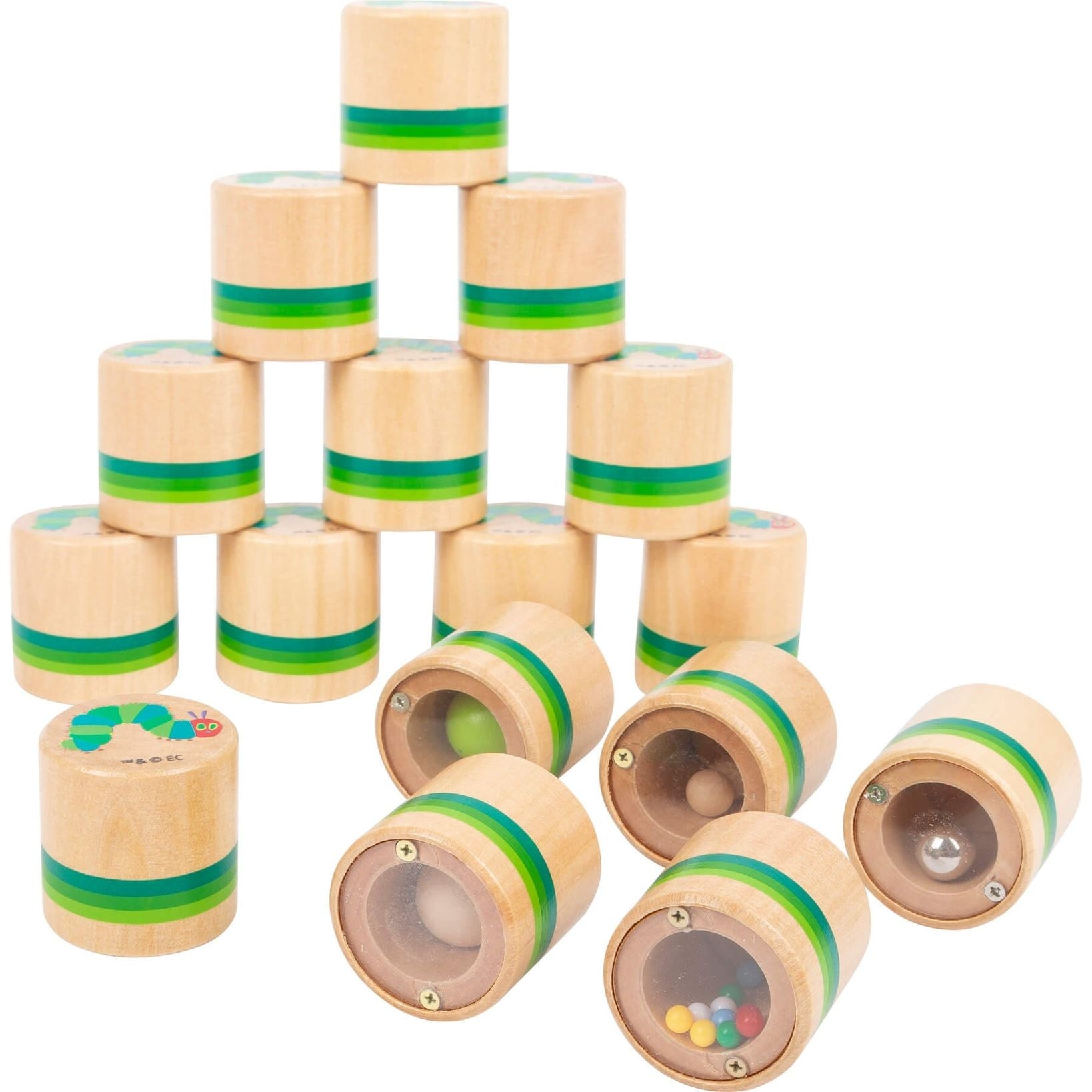 Hör mal genau hin! Bei diesem Hör-Memo im Raupe Nimmersatt-Design gilt es, Geräuschunterschiede zu erkennen und zu benennen. Durch Schütteln und genaues Hinhören ermitteln die Spieler, welche zwei Holzdosen des Sinnesspiels zusammengehören. Auch das Gewicht ist bei der Suche hilfreich! Durch die Scheibe auf der Unterseite der Dosen kann das Ergebnis kinderleicht kontrolliert werden. Ohren auf! Hier ist der Spielspaß für die ganze Familie vorprogrammiert. Wer hat am Ende die meisten Pärchen gesammelt?
