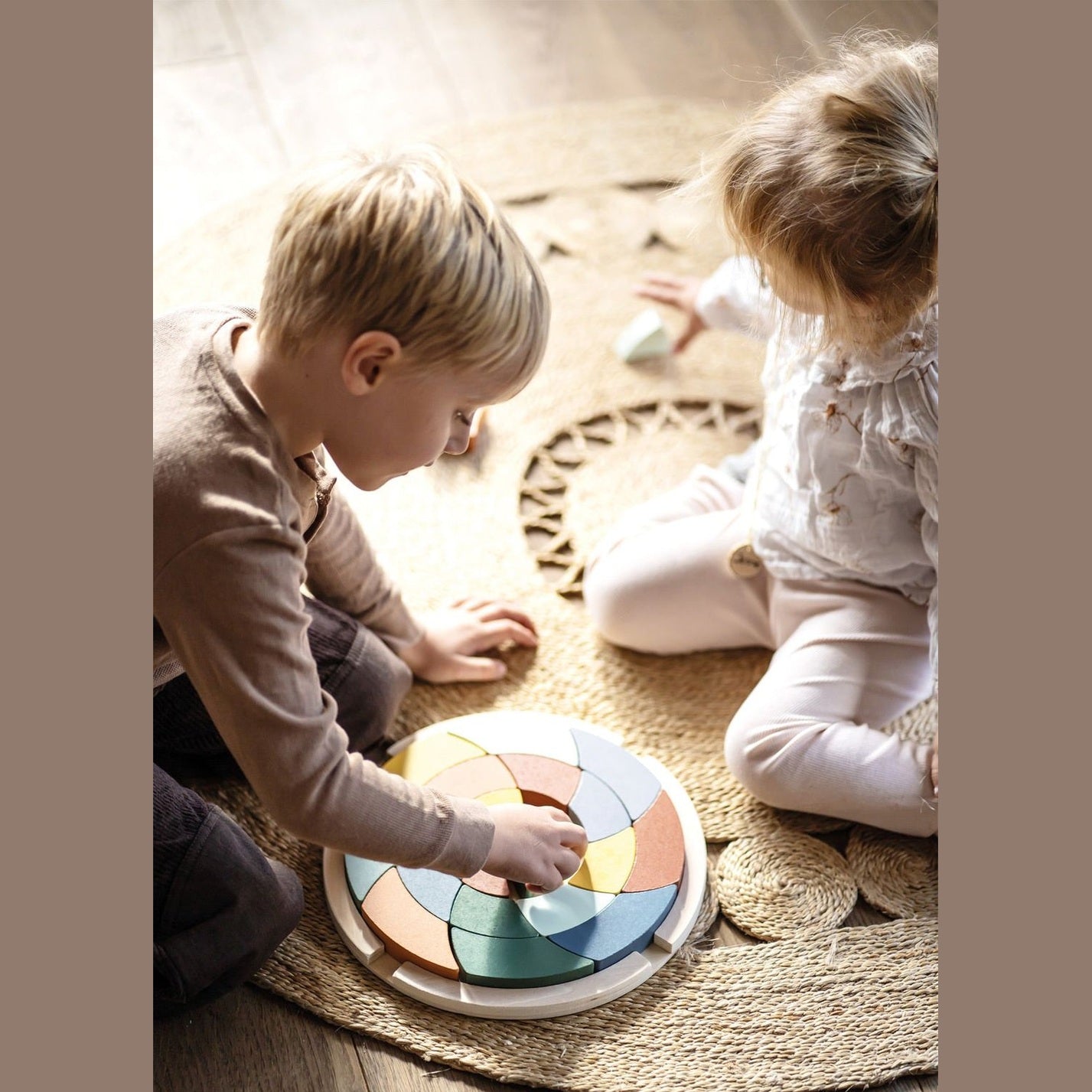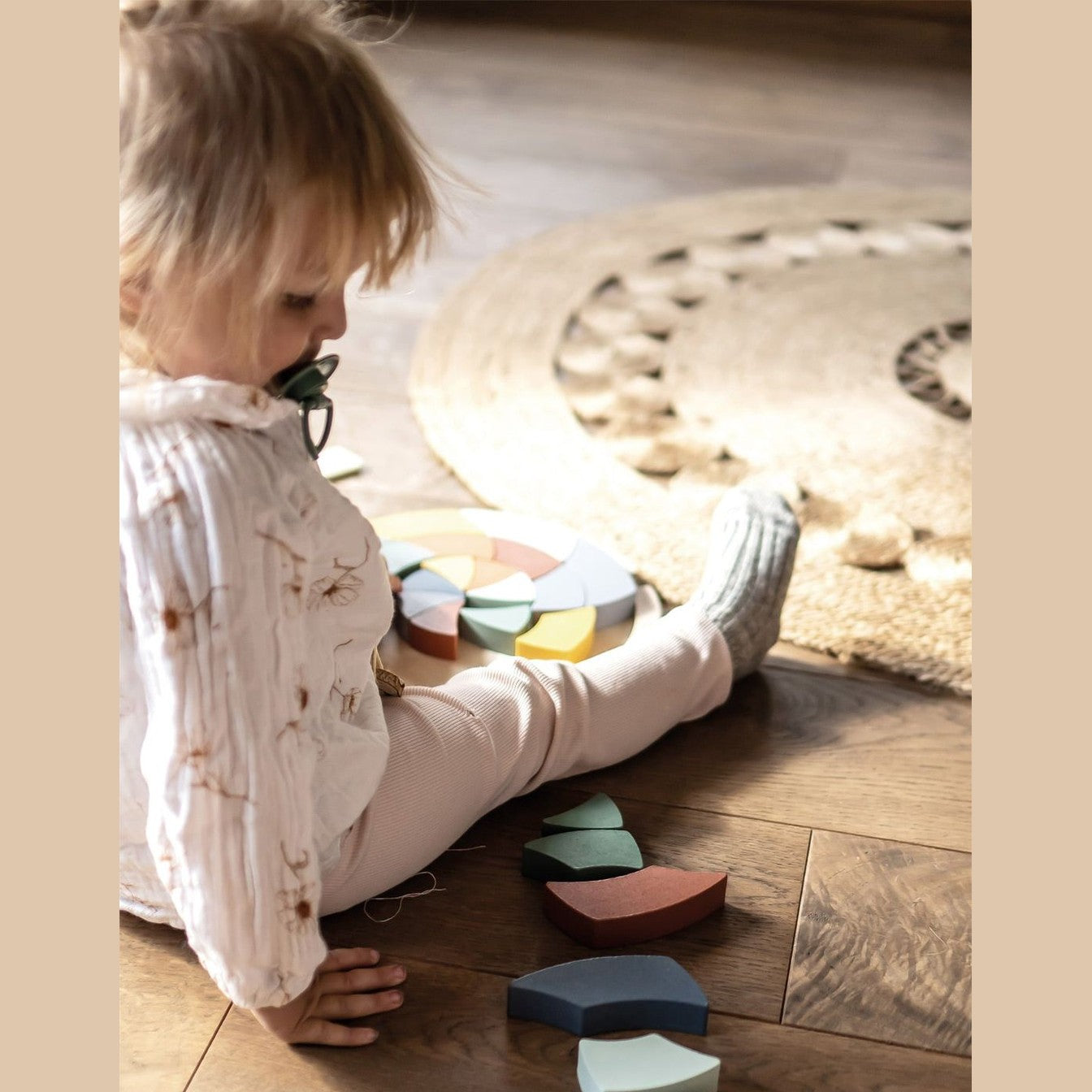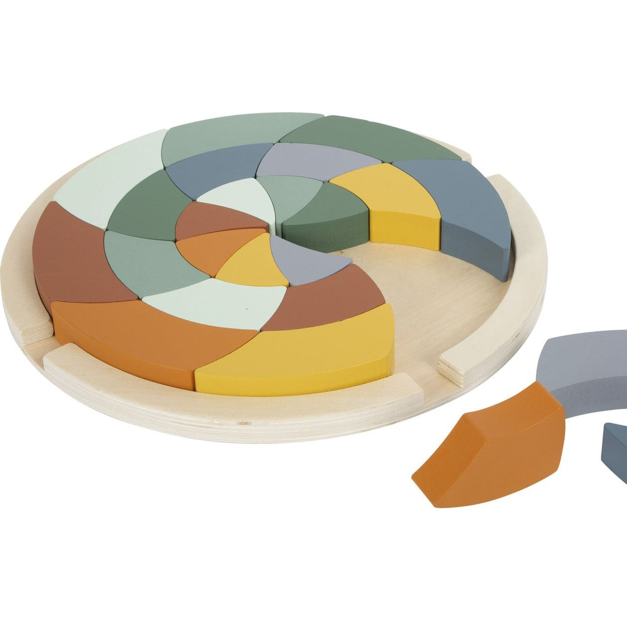 Dieses vielseitige Farbenpuzzle bestehend aus 24 Steinen in modernen Farbtönen lädt spielerisch zum Puzzeln, Sortieren, Stapeln und Musterlegen ein. Das von der Montessori-Pädagogik inspirierte Farbenspiel animiert Kinder zum kreativen und fantasievollen Spielen, während es nebenbei die Vorstellungskraft trainiert und ein Verständnis für verschiedene Größen, Farben und Formen vermittelt. Die Puzzleteile aus Holz können dabei sowohl innerhalb als auch außerhalb des Puzzle-Rahmens zu individuellen Mustern zusammengelegt werden. Puzzle und Kreativspiel in einem! Die multifunktionalen Bausteine ergeben zusammengelegt ein schönes Mandala-Motiv, können aber auch losgelöst von dem runden Holzbrett als Holzbausteine zum Stapeln und kreativen Bauen verwendet werden. Aufgrund der hochwertigen Gestaltung auch dekorativ ein Hingucker im Kinderzimmer.