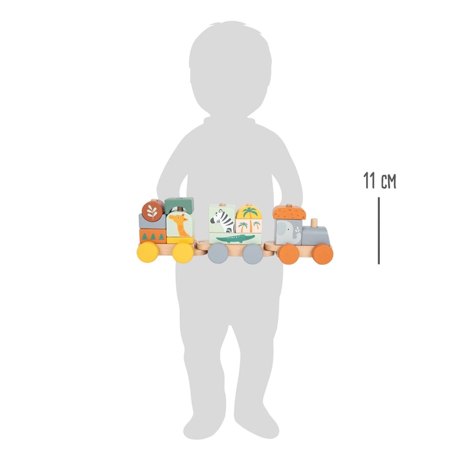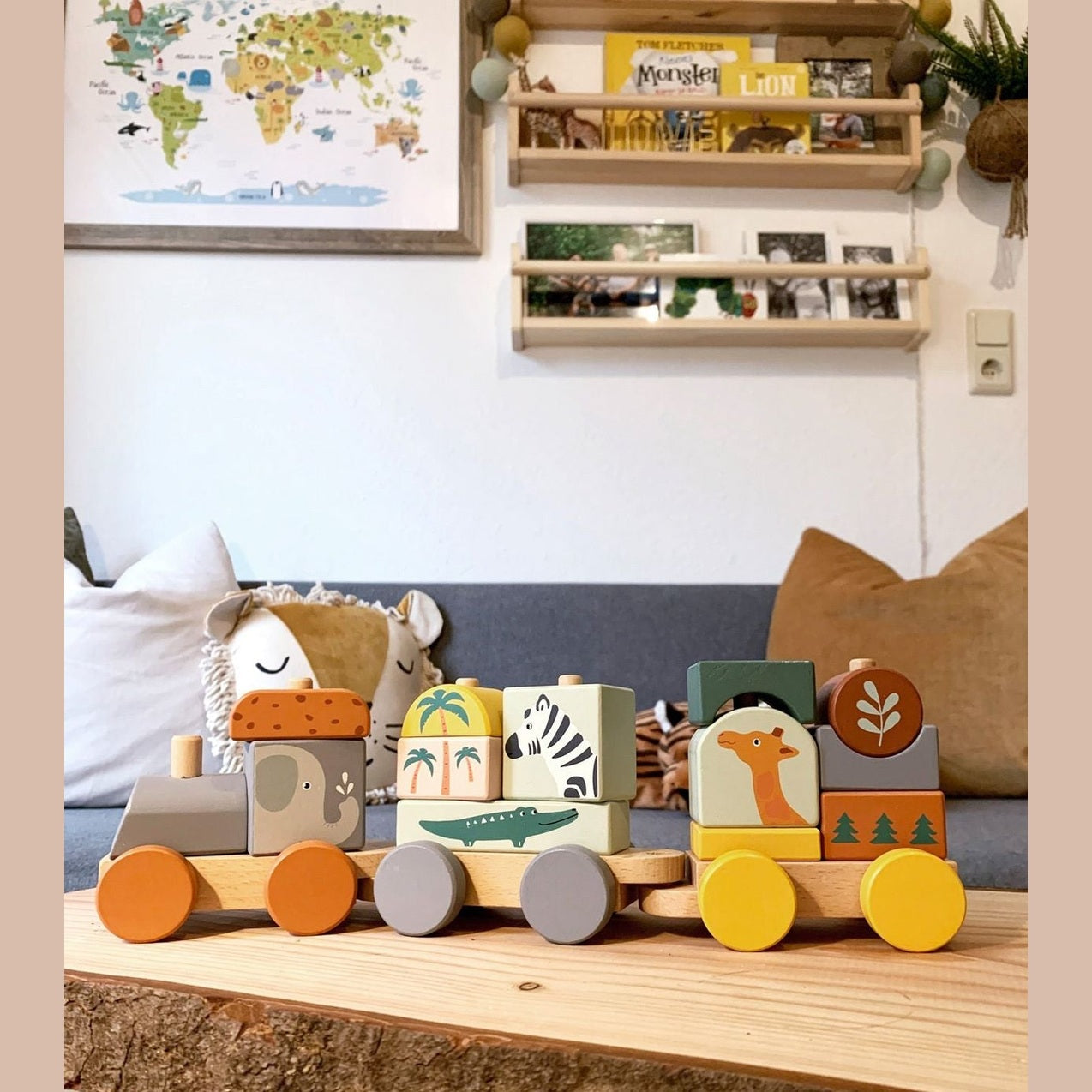 Zusammenstecken und Abfahren! Auf große Reise durchs Kinderzimmer geht dieser Holzzug in Trendfarben nur, wenn Elefant, Giraffe, Zebra & Co. eingestiegen sind! Der detailreiche Zug, der gleichzeitig ein Steck- und Stapelspiel ist, bietet Kindern die Möglichkeit, ihn nach eigenen Ideen zusammen zu bauen. Die Steckbausteine können auch separat als Bauklötze verwendet werden. Nächster Halt: Safari! Beim Spielen und beim Zusammenbauen der einzelnen Steckelemente werden ganz nebenbei die motorischen Fähigkeiten trainiert. Für langanhaltenden und abwechslungsreichen Spielspaß im Kinderzimmer!