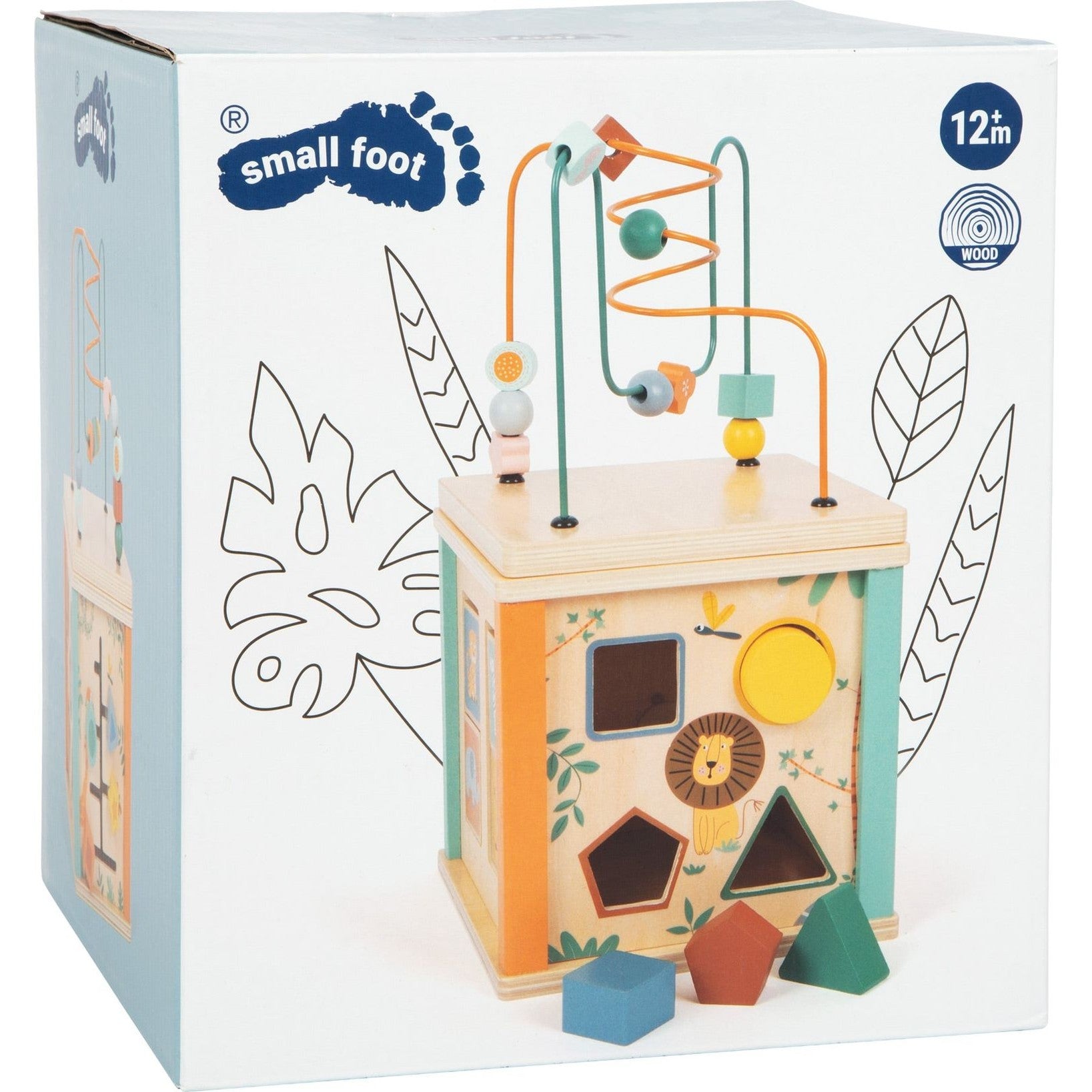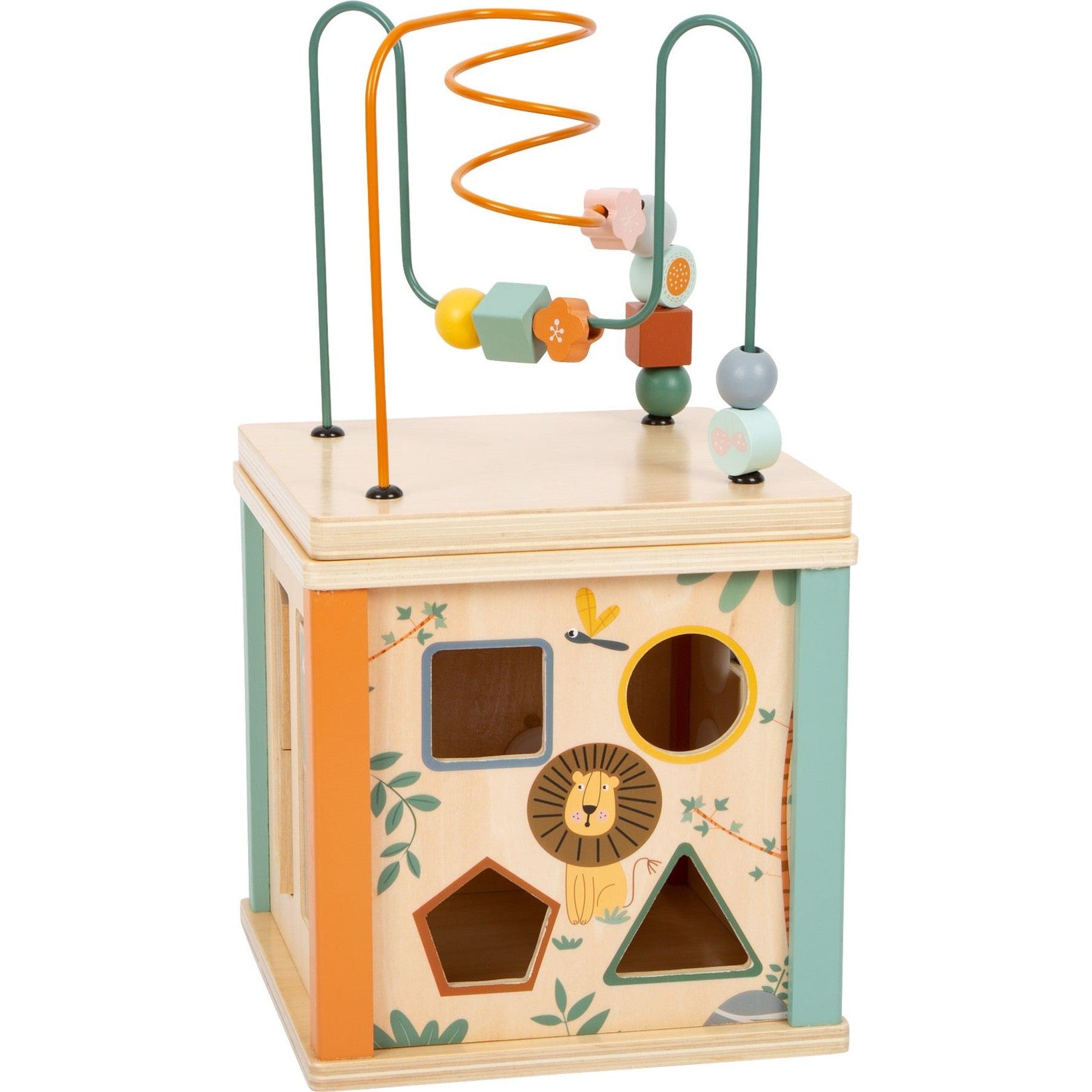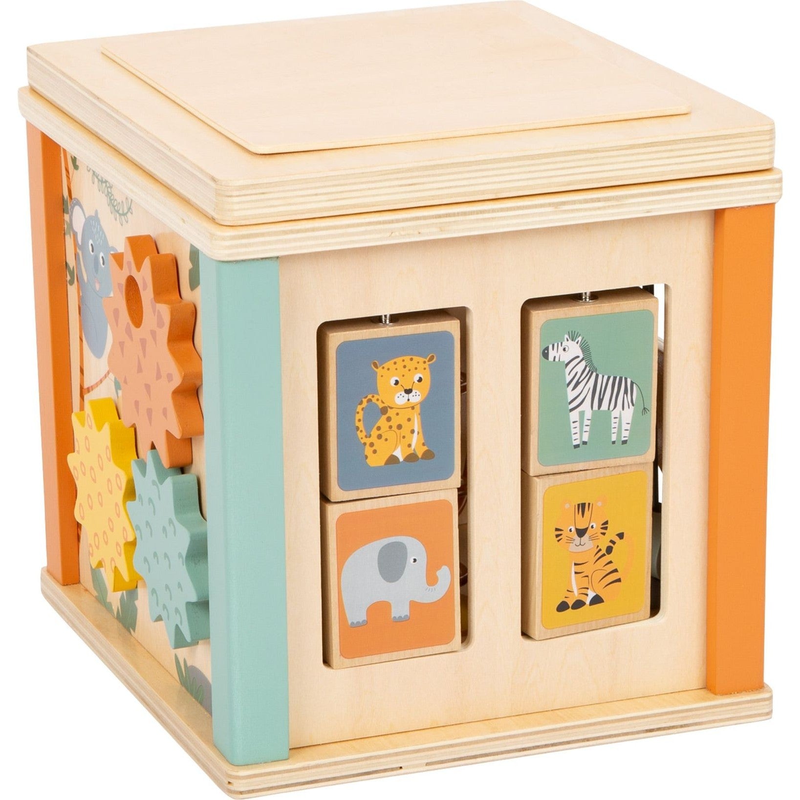 Tier-Safari im Motorik-Dschungel! Mit zwei Motorikschleifen, Formen-Steckspiel, Schiebelabyrinth, Drehklappen und einem Zahnrad-Spiel auf insgesamt fünf bespielbaren Seiten ist dieser Motorikwürfel aus stabilem Holz nicht nur ein Alleskönner in punkto Spielen und Entdecken, sondern durch die moderne Farbgebung und den hohen Naturholzanteil auch ein Hingucker im Kinderzimmer. Dass die niedlichen Safari-Tiere kleine Entdecker auf allen Würfelseiten wiederkehrend begleiten, fördert die Neugierde und sorgt für langanhaltende Beschäftigung. Der abnehmbare Deckel kann umgedreht im Würfel verstaut werden und passt so platzsparend in jedes Kinderzimmerregal. Dieser Motorikwürfel trainiert die Wahrnehmung von Formen und Farben, fördert Geschicklichkeit und Feinmotorik, verbessert die Hand-Auge-Koordination und regt die Fantasie an.