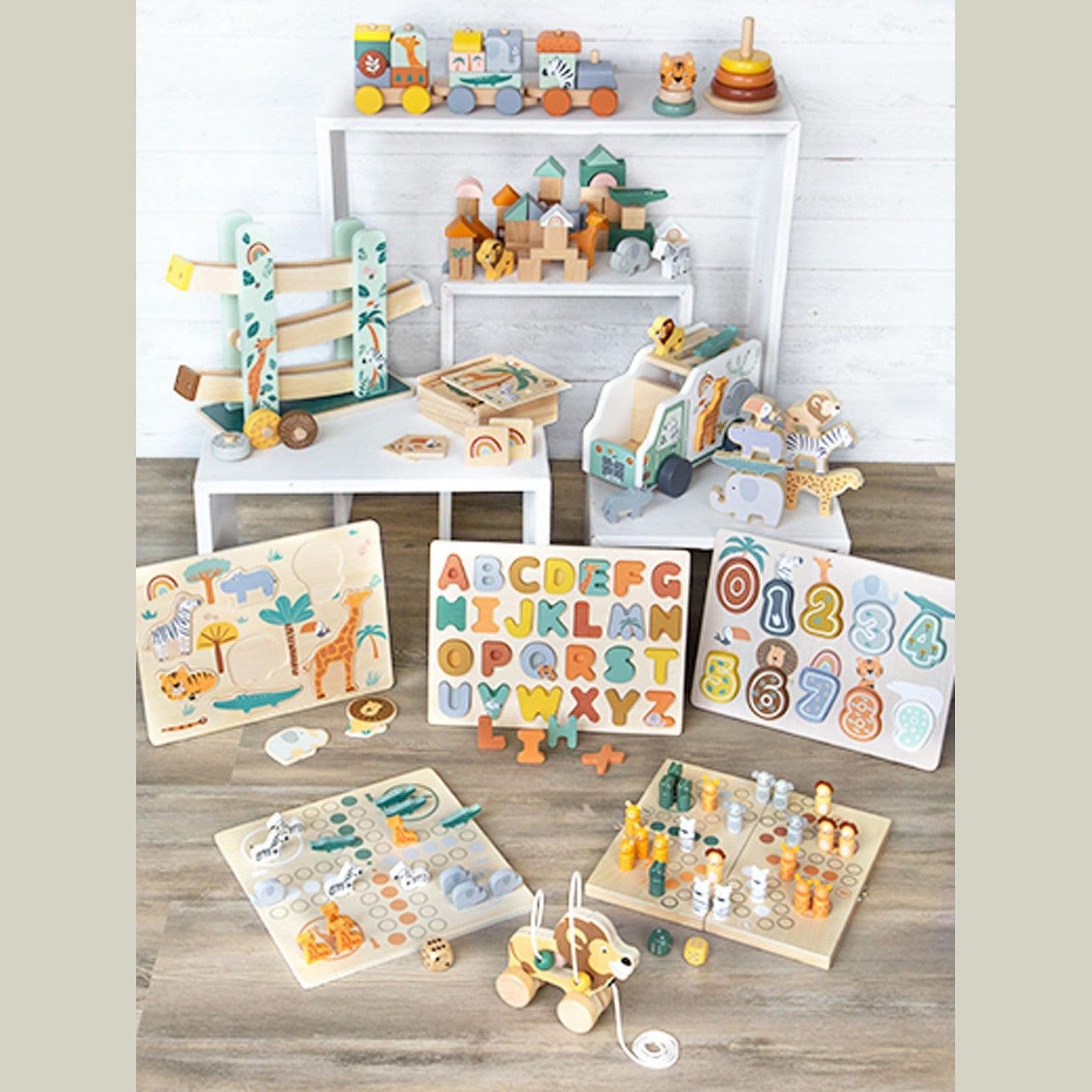 Safari-Tiere wollen hoch hinaus! Bei dieser Variante des beliebten Wackelturm-Kultspiels ist spannender Spielspaß und Nervenkitzel garantiert. Zunächst wird ein Turm aus Holzsteinen und Böden gestapelt, dessen „Säulen“ anschließend mit ruhiger Hand reihum herausgenommen werden müssen - ohne dass der Turm einstürzt! Der Farbwürfel gibt an, welche Säule gezogen werden muss. Ein klassisches Gesellschaftsspiel im modernen Safari-Look, das die ganze Familie begeistert und dank niedlicher Motive aus der Tierwelt für Kinder besonders ansprechend ist. Ganz nebenbei wird spielerisch Konzentration, Motorik und Hand-Augen-Koordination trainiert. Wer beweist eine ruhige Hand?