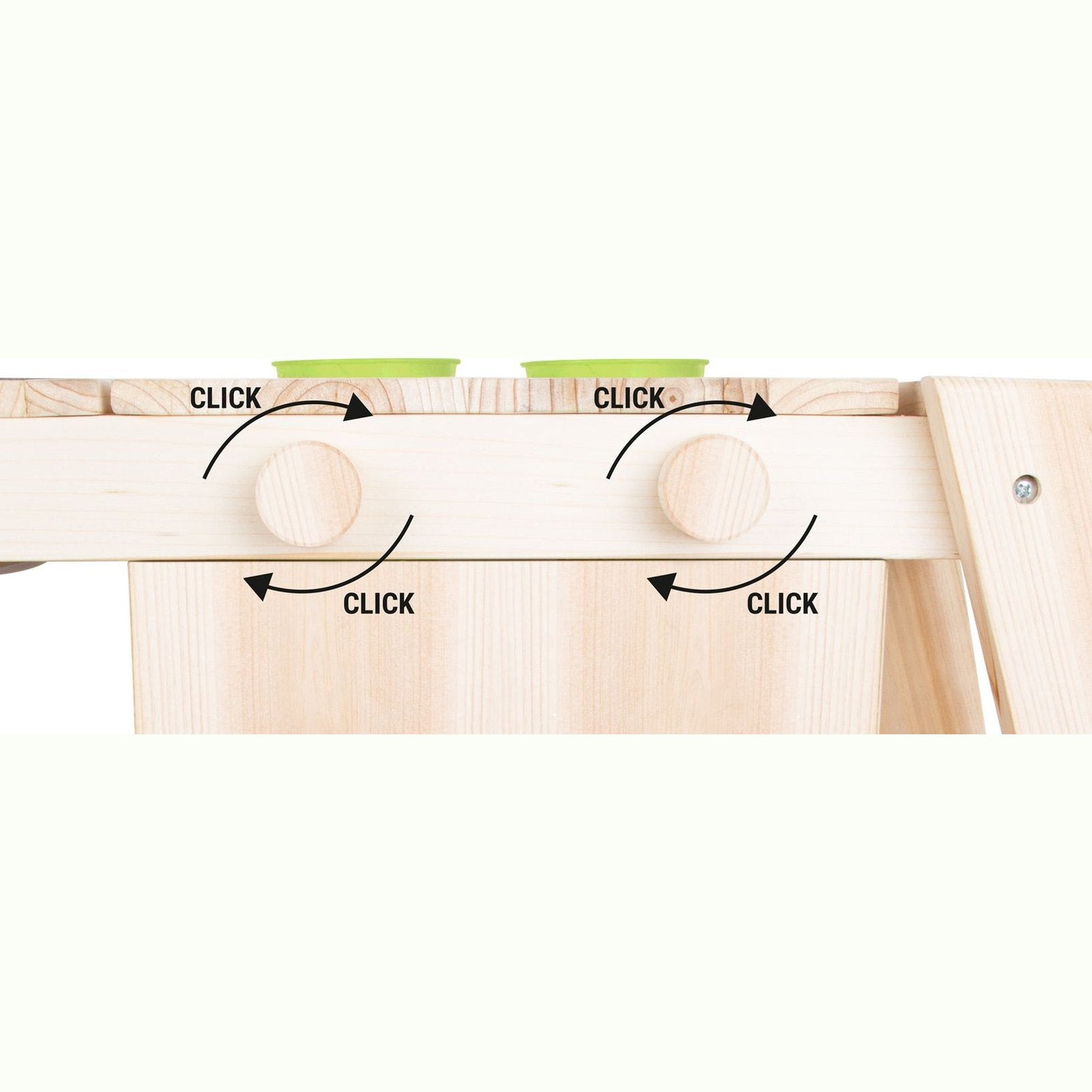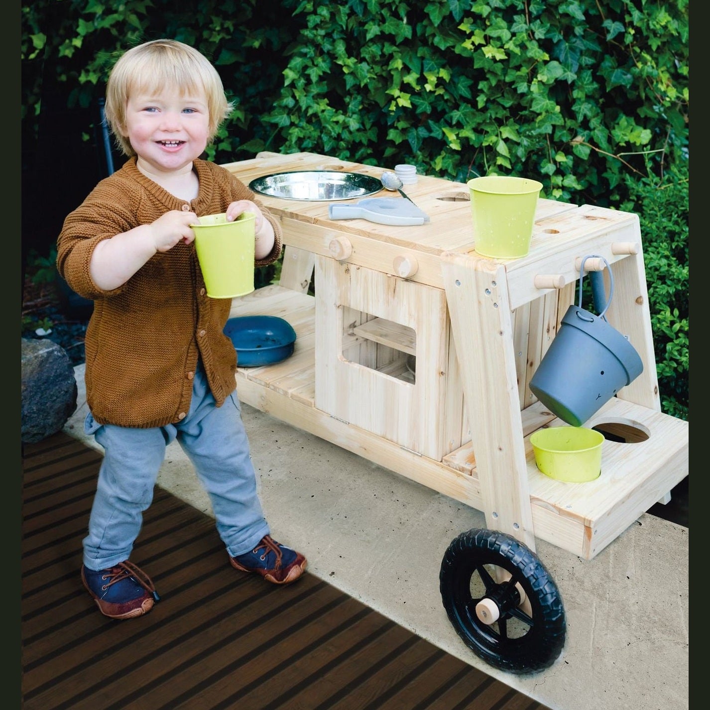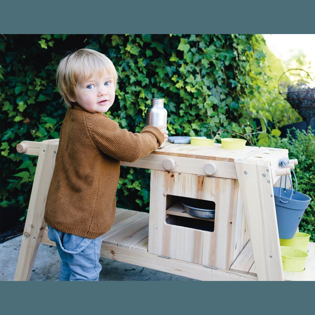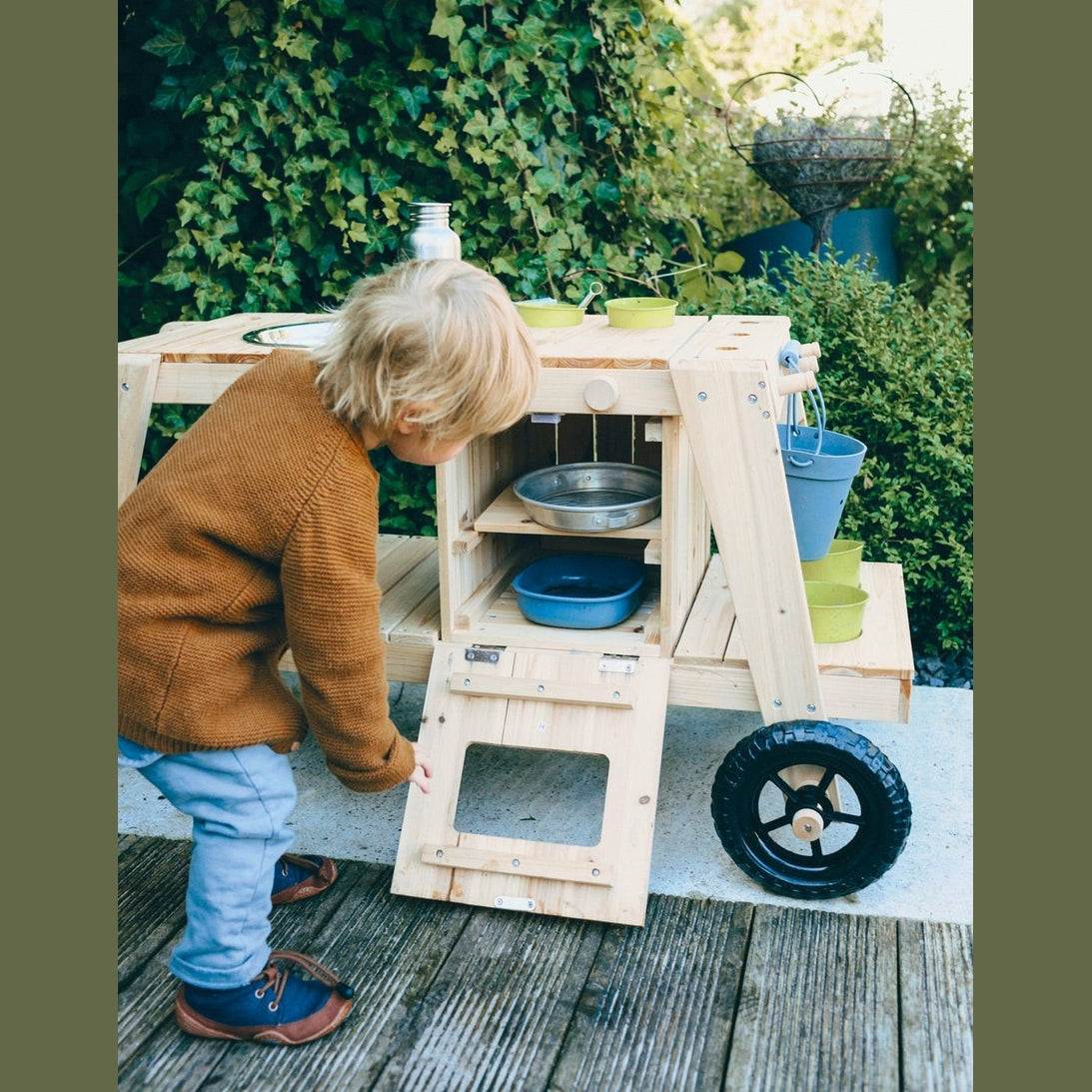 Sand + Wasser = Matsch & Spaß! Diese stabile, witterungsbeständige und modern gestaltete Matschküche aus unbehandeltem Massivholz ist der neue Star im Garten und auf dem Balkon! Von allen vier Seiten bespielbar, bietet sie als Outdoorküche mehreren Kindern Platz für kreatives Spiel. Einzigartig: Dank unkaputtbarer Räder lässt sie sich nach Herzenslust verschieben! Ein Backofen, dessen zwei Drehknöpfe ein „Klickgeräusch“ machen, eine große Matschschüssel, zwei Matschtöpfchen und zwei Pflanztöpfe aus Metall sowie Aussparungen, Langlöcher, Haken und Staufläche für die Ordnung von Gartengeräten, Kochequipment und Matschutensilien machen die außergewöhnliche „Sommerküche“ komplett! Diese Matschküche lädt Kinder ein, nach Herzenslust zu matschen. Ein besonderes Spielhighlight stellt der Backofen dar! Für das Einschieben des „Backblechs“ verfügt er über zwei vormontierte Leisten. Die Backofentür kann durch das Hineingreifen in die Aussparung komplett geöffnet werden. Ein Magnetschnapper sorgt für ein sicheres Schließen der Tür. Die zwei Pflanztöpfe können nicht nur zum Matschen verwendet werden, sondern auch mit Blumen, Kräutern und vielem mehr bepflanzt werden oder dienen als Sammelbehälter. Auch die beiden kleinen Töpfe in der oberen Fläche sind zum Organisieren von kleineren Teilen nutzbar. Langes Gartenwerkzeug kann mit Hilfe der Langlöcher durch zwei Ebenen sicher verstaut werden. Für eine langlebige Nutzung kann das unbehandelte Holz mit einer Holzschutzlasur farblich an die eigenen Bedürfnisse angepasst werden.