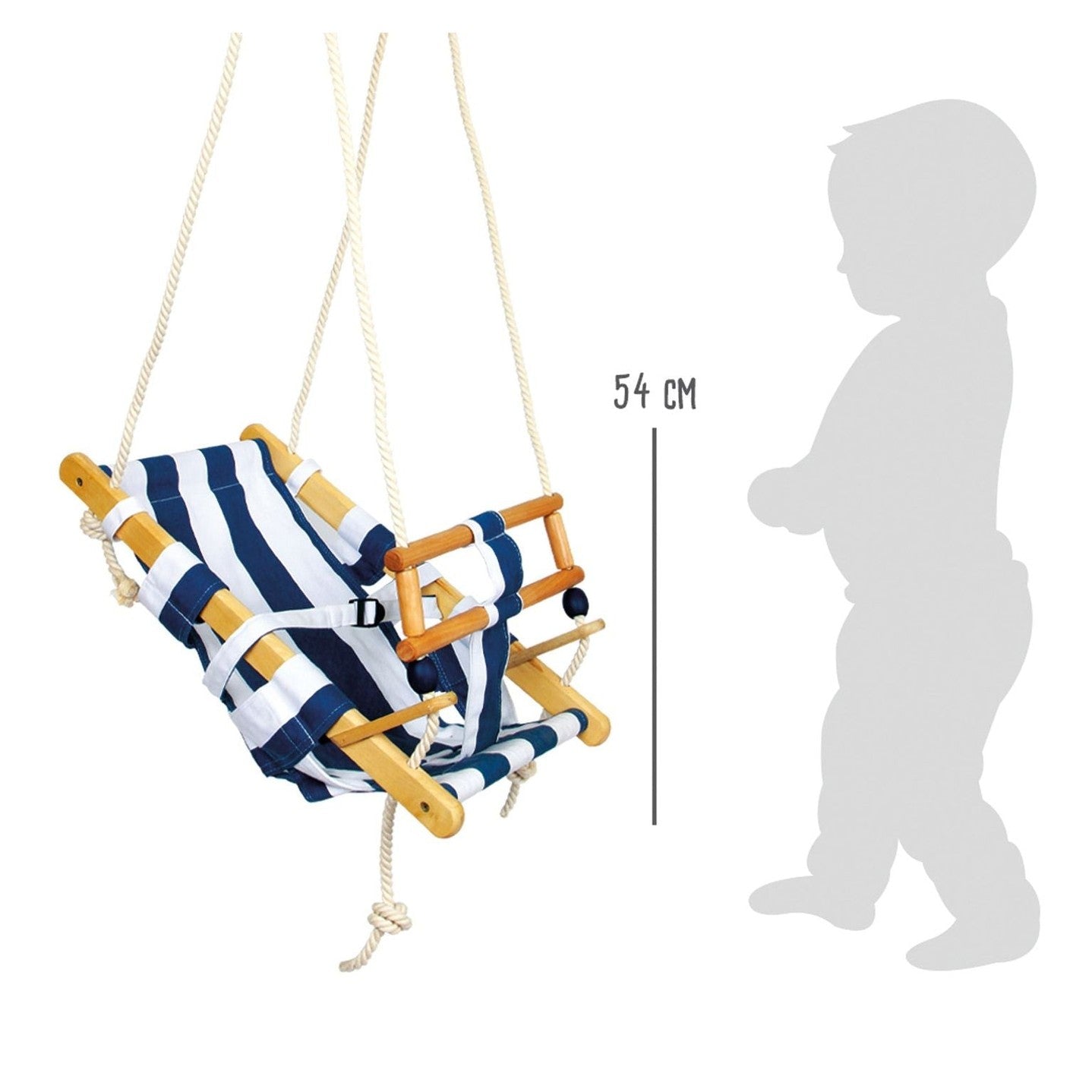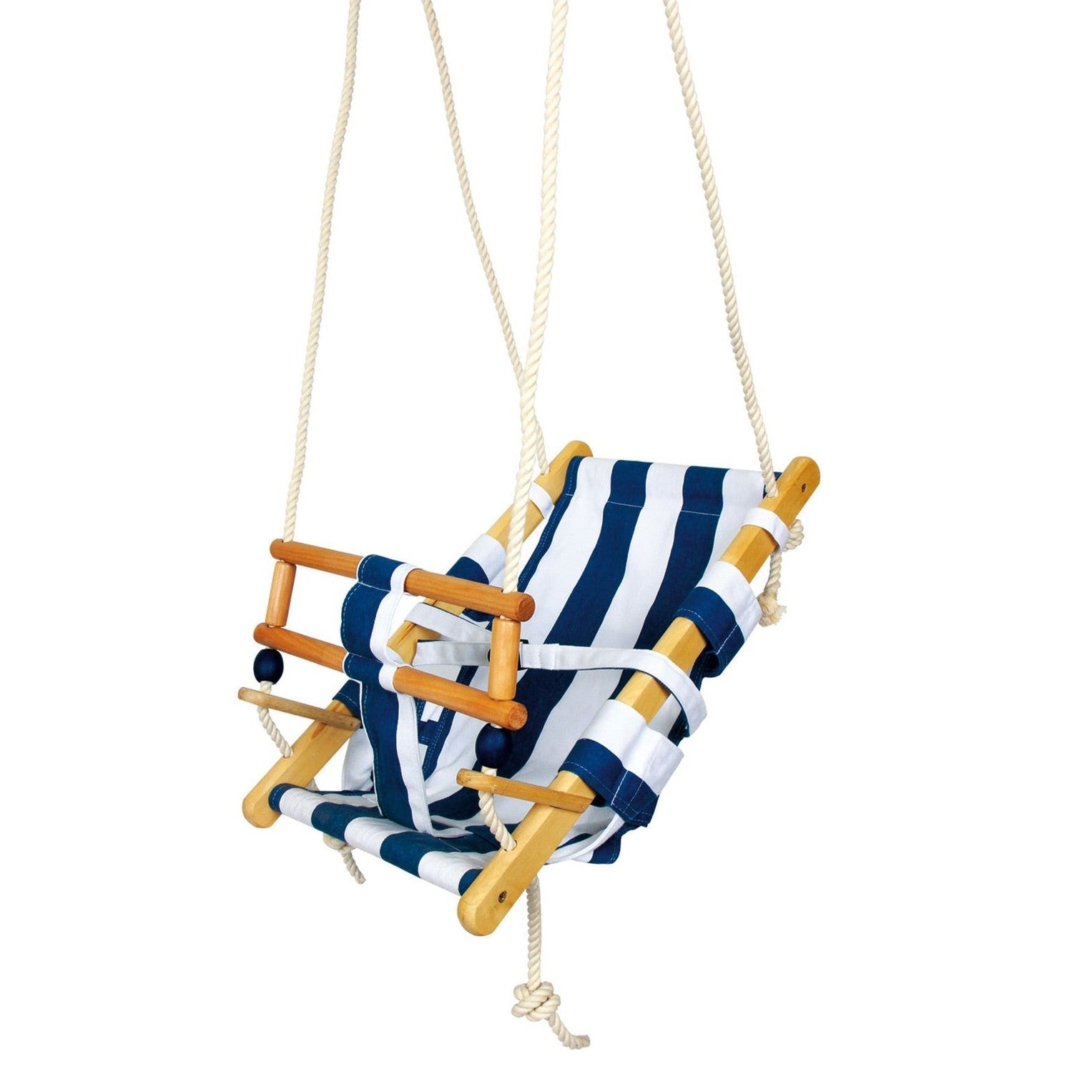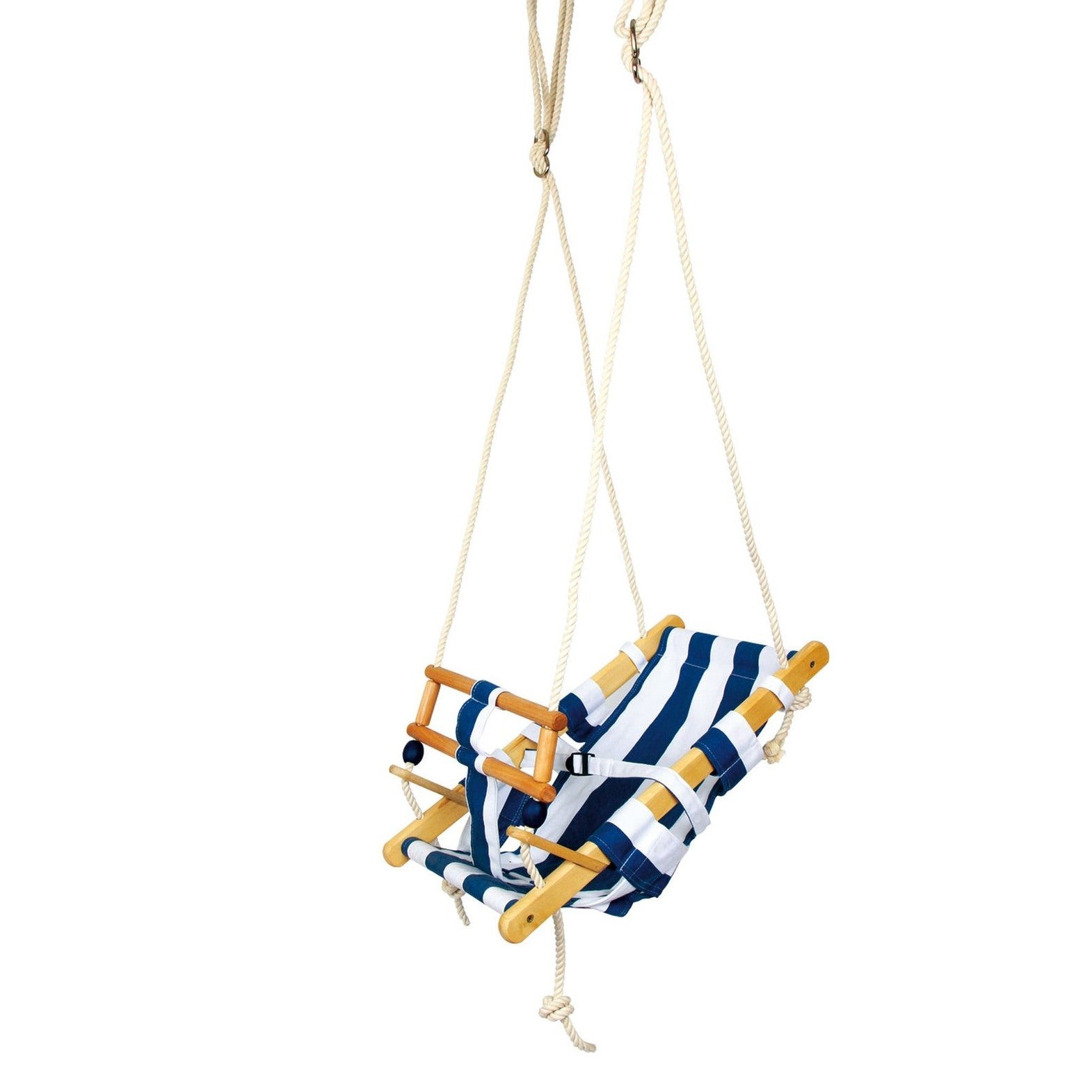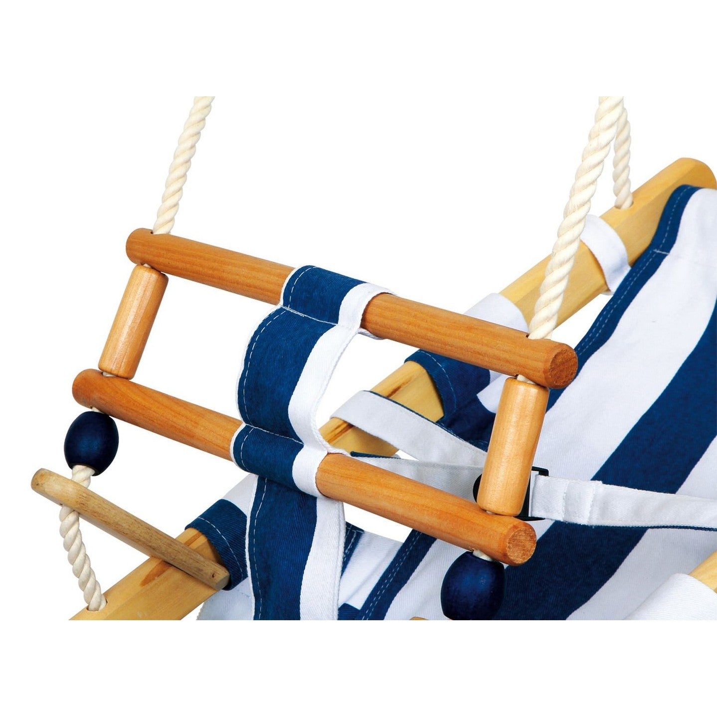 Schaukel aus glatt geschliffenen Massivhölzern! Das feste Textil in Weiß und Blau bietet eine bequeme Liegefläche und macht sogar Mama und Papa neidisch auf diese Ruhezone. Sicherheitsgurt und die Stoffbahn zwischen den Beinen hält die Kinder leicht und sicher!