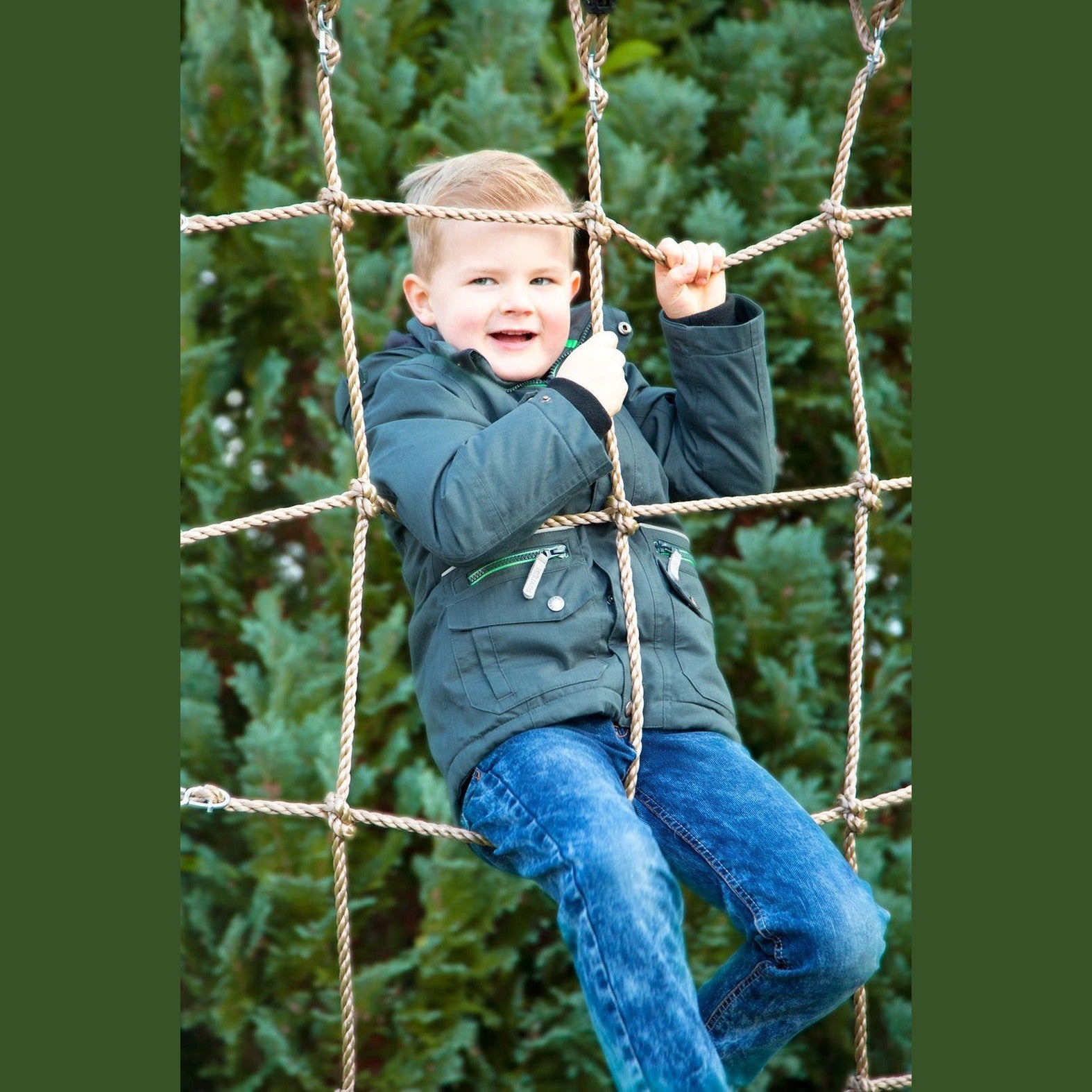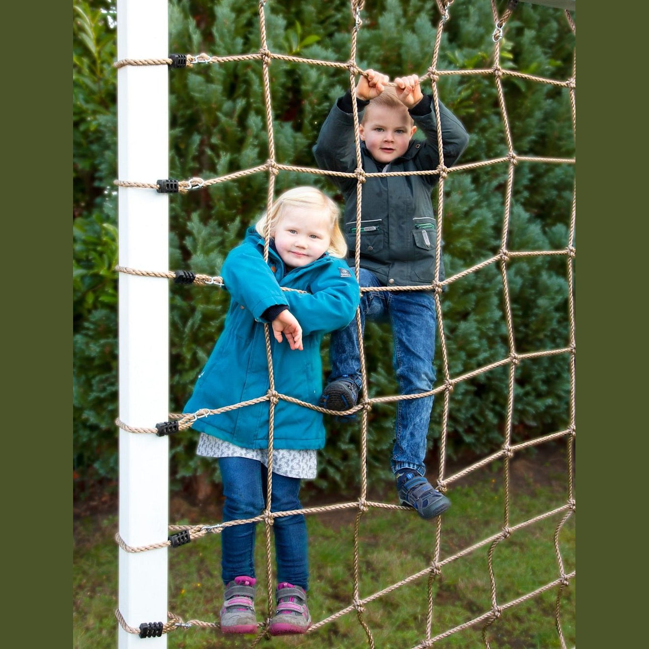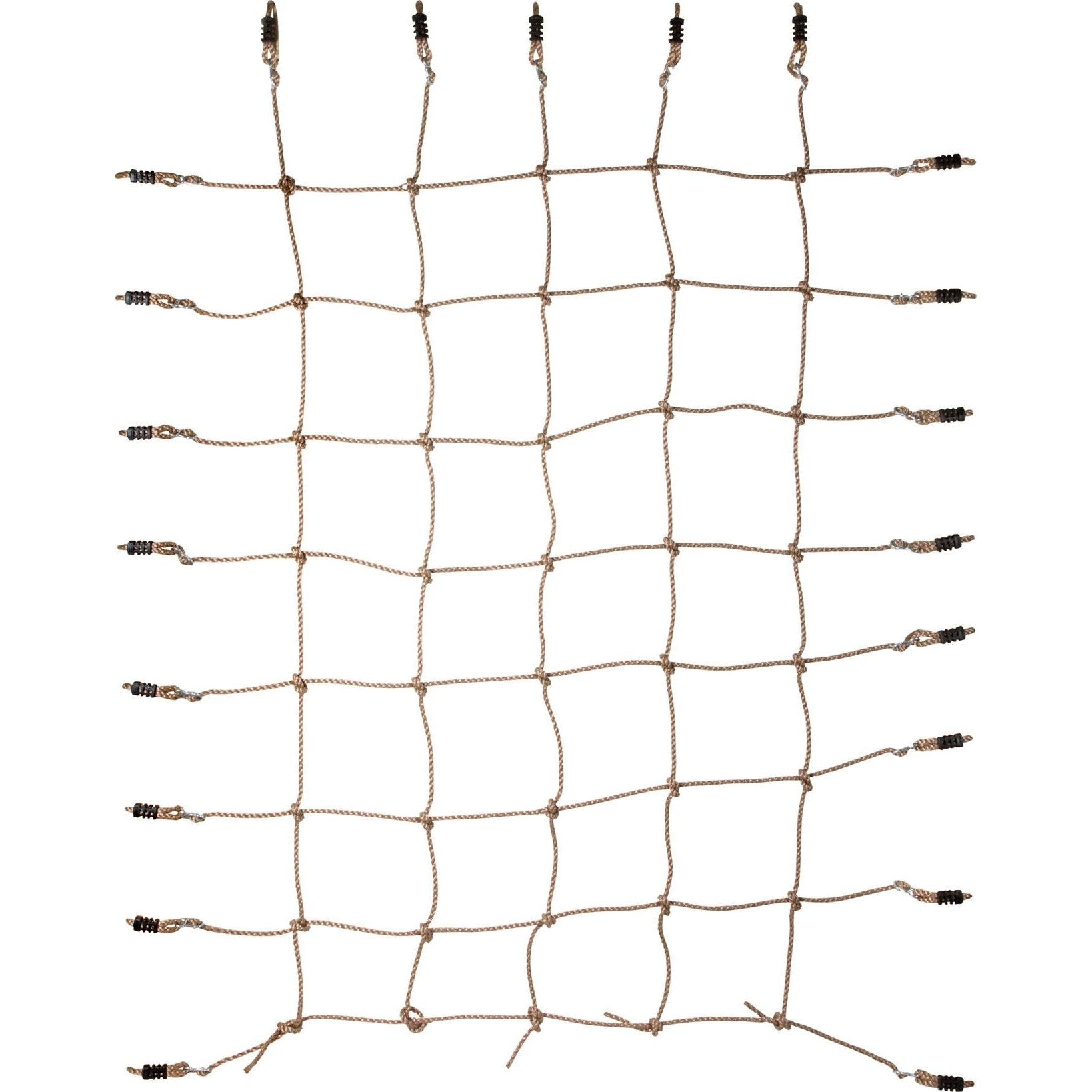 Mit diesem robusten Kletternetz in Naturseil-Optik kennt der Kletterspaß keine Grenzen. Mit handgeknüpften Knoten, offenen Schlaufen und stabilen Achterhaken zur einfachen und flexiblen Befestigung an dreiseitigen Holzrahmen und Klettergerüsten. Offene Schlaufen mit Achterhaken oben und an den seitlichen Rändern. Perfekt für den heimischen Spielturm oder das Klettergerüst und ein großer Spaß für kleine Kletteraffen, bei dem sie nebenbei Kraft und Ausdauer trainieren. Wer kommt bis ganz nach oben? Ohne Balken.