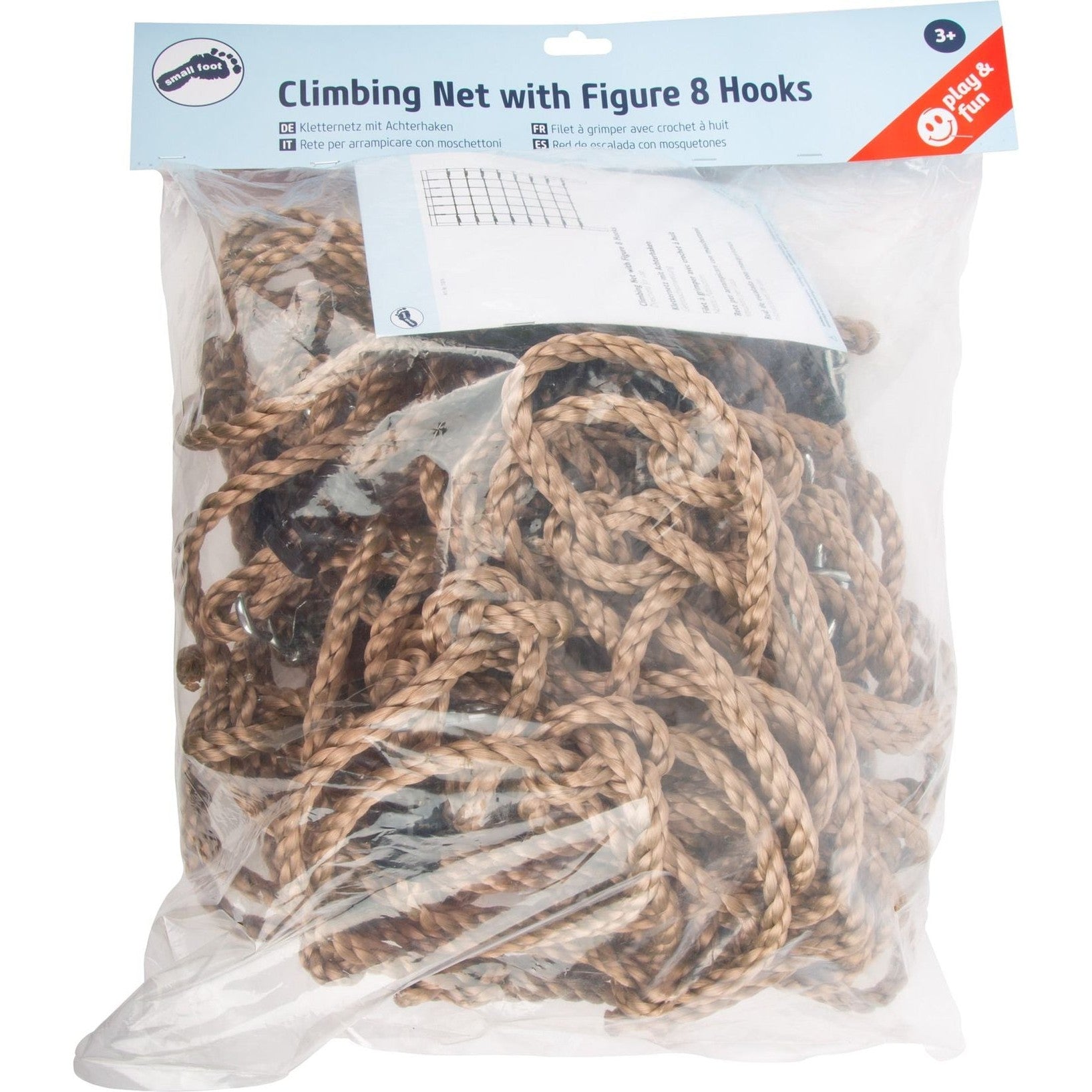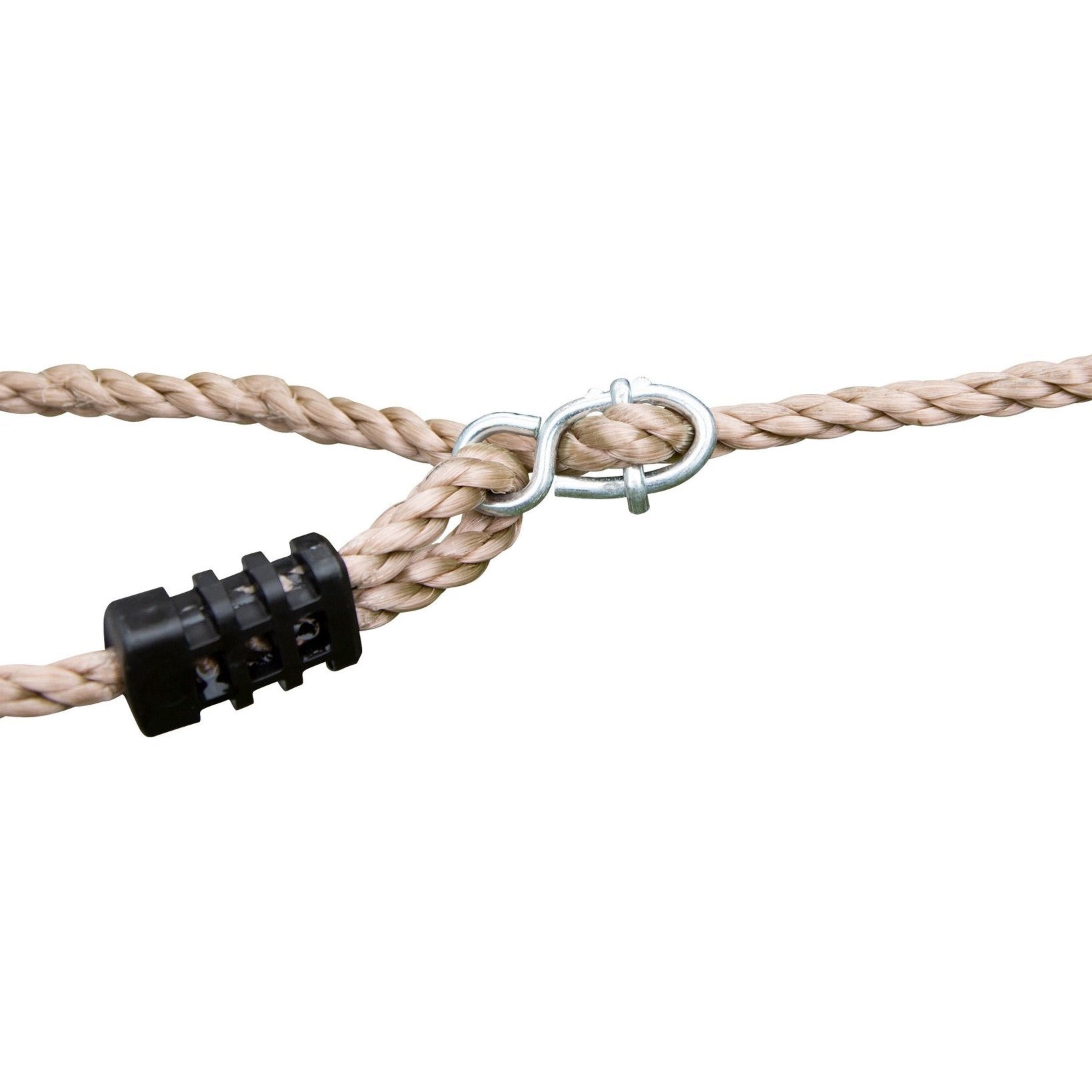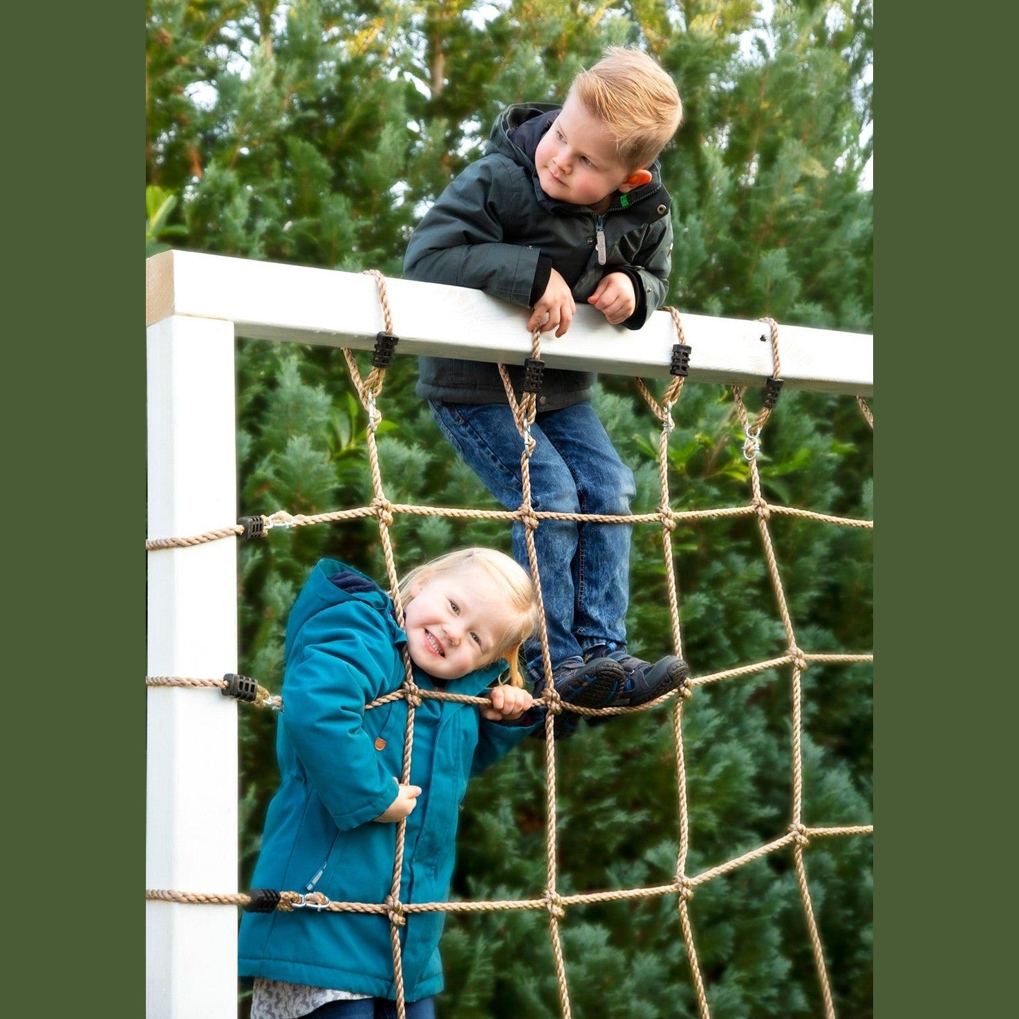 Mit diesem robusten Kletternetz in Naturseil-Optik kennt der Kletterspaß keine Grenzen. Mit handgeknüpften Knoten, offenen Schlaufen und stabilen Achterhaken zur einfachen und flexiblen Befestigung an dreiseitigen Holzrahmen und Klettergerüsten. Offene Schlaufen mit Achterhaken oben und an den seitlichen Rändern. Perfekt für den heimischen Spielturm oder das Klettergerüst und ein großer Spaß für kleine Kletteraffen, bei dem sie nebenbei Kraft und Ausdauer trainieren. Wer kommt bis ganz nach oben? Ohne Balken.