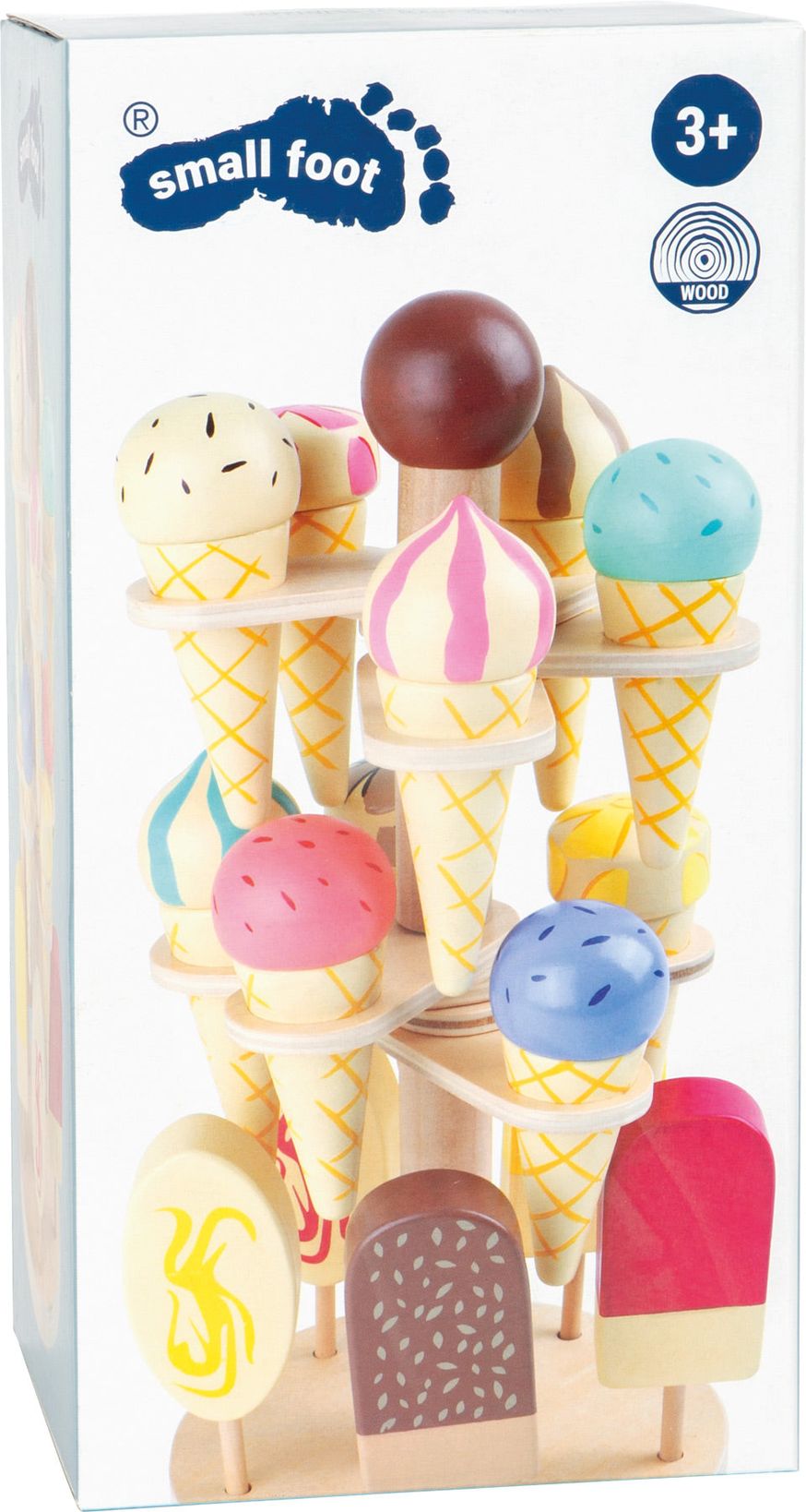 Dieser Eiständer in Form einer Etagere lässt keine Wünsche offen. Die Eistüten aus Holz lassen sich in bewegliche Halterungen stecken und das Eis am Stiel steckt in vorgebohrten Löchern im Boden. Ein leckeres, farbenfrohes Potpourri.