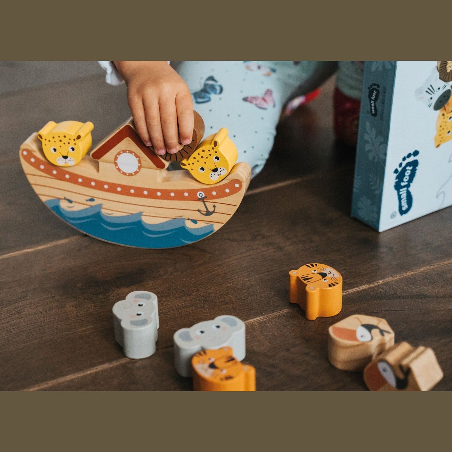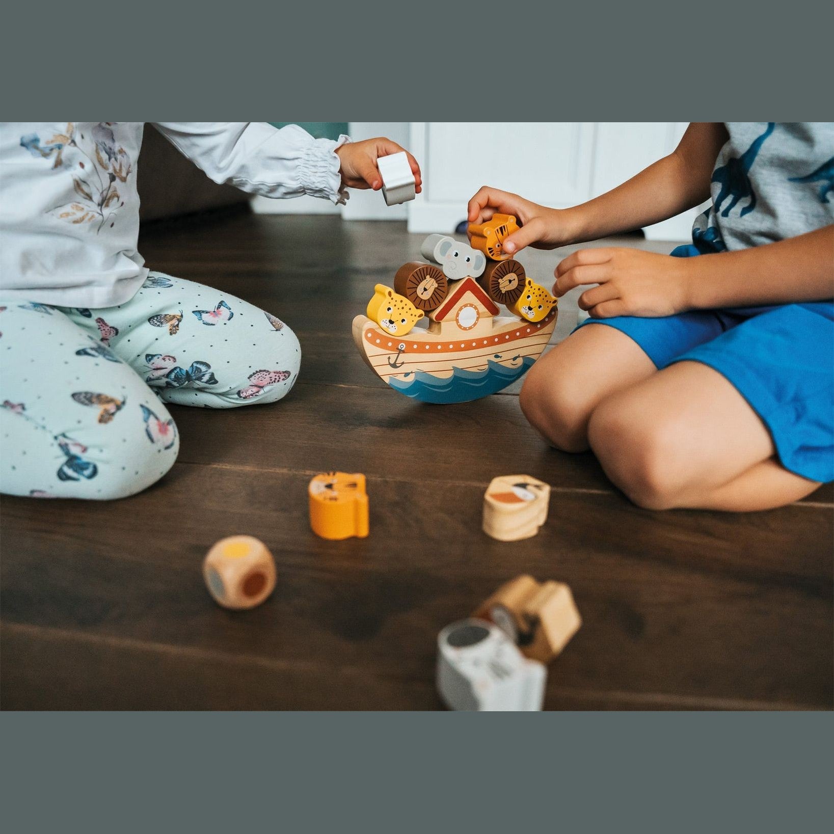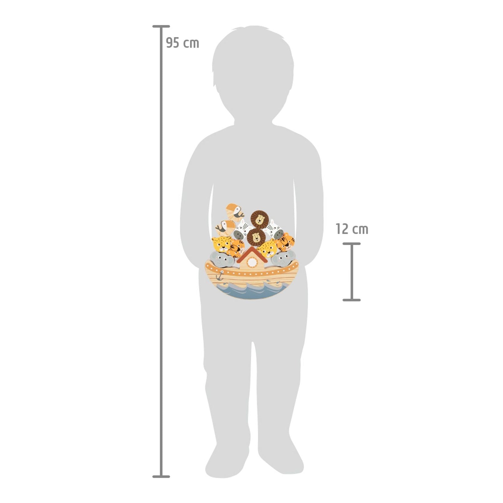 Wer mit dieser Arche aus Holz unterwegs ist, braucht ein ruhiges Händchen! Beim Stapeln aller 6 Tierpaare lernen Kinder spielerisch etwas über Balance und Gleichgewicht. Ganz nebenbei wird die Feinmotorik, Geduld und Hand-Auge-Koordination geschult. Um das Spiel bei Bedarf ein bisschen kniffliger zu machen, können die einzelnen Tiere mit dem Farbwürfel ausgewürfelt werden und dürfen erst dann Platz nehmen. Ein tolles Geduldsspiel für die ganze Familie, das alleine oder mit mehreren Personen gespielt werden kann. Alle Tiermotive sind liebevoll gestaltet und überzeugen durch hochwertigen Druck und die moderne Farbgebung.