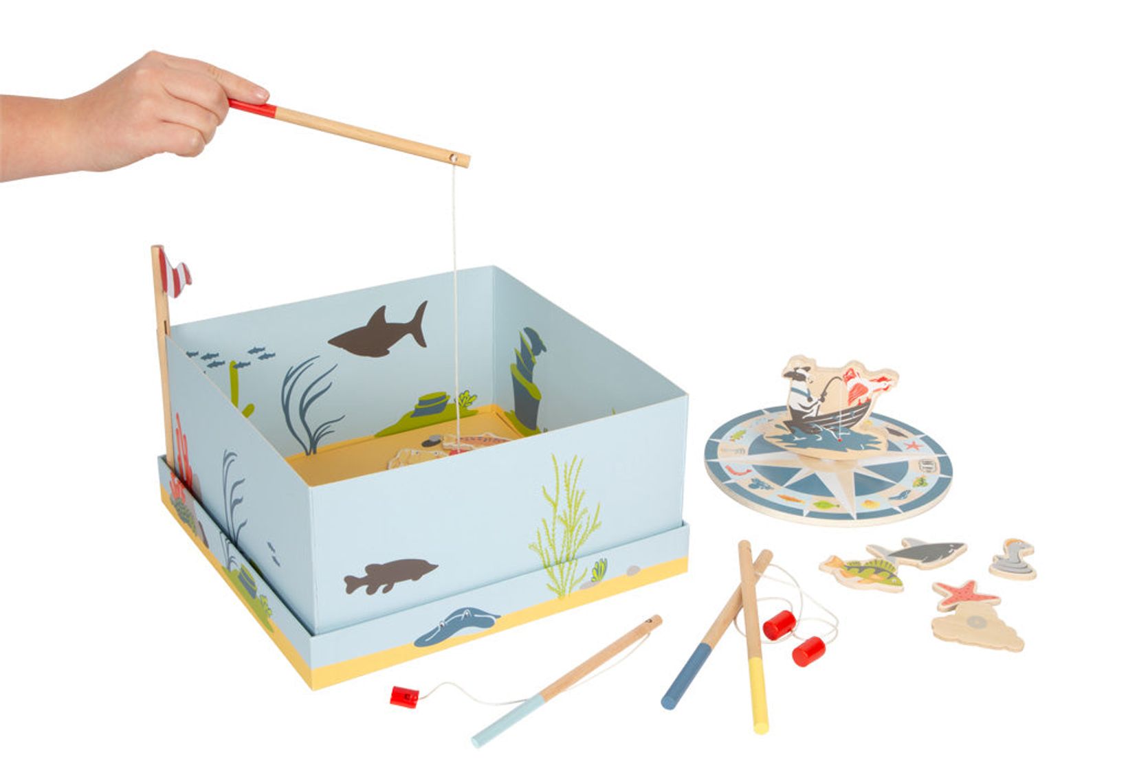 Fische angeln mit tierischen Freunden! Bei diesem klassischen Kinderspiel aus Holz sind Geschicklichkeit und Geduld gefordert, denn es gilt, mithilfe der vier Holzangeln die richtigen Meeresbewohner heraus zu fischen. Während die Kuh angelt, hält der Hahn Ausschau, was wohl als nächstes geangelt wird. Durch Drehen des Bootes auf dem Kompass wird bestimmt, welches Meerestier gefangen werden muss. Praktisch: Die Bodenschachtel des hochwertigen Stülpkartons fungiert zusammen mit Ergänzungswänden als dreidimensionales Spielfeld. In zwei Varianten spielbar. Ein großer Spaß für kleine Angel-Fans, der sowohl allein als auch mit Freunden gespielt werden kann und bei dem ganz nebenbei Bewohner aus Nordsee, Ostsee und europäischen Binnengewässern kennengelernt werden. Gelingt das Angeln des richtigen Tieres, so wandert dieses in den Fischvorrat des angelnden Spielers. Wird das falsche Tier geangelt, muss es wieder ins Wasser geworfen werden. Mit hochwertigem Spielkarton zur Aufbewahrung.