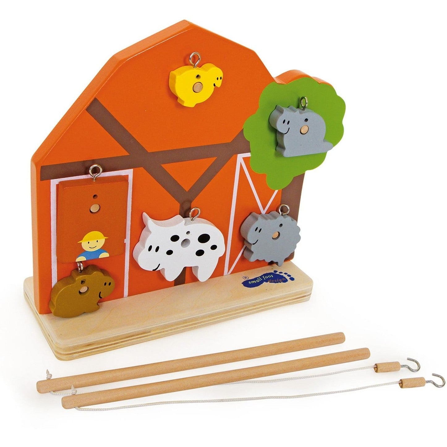 Wer angelt am schnellsten alle Bauernhoftiere? Bei diesem aufstellbaren Angelspiel aus Holz mit zwei Angeln und zwölf Spielfiguren geht es darum, gleichzeitig in Konkurrenz zu treten. Wer hat denn da eine Kuh geangelt?