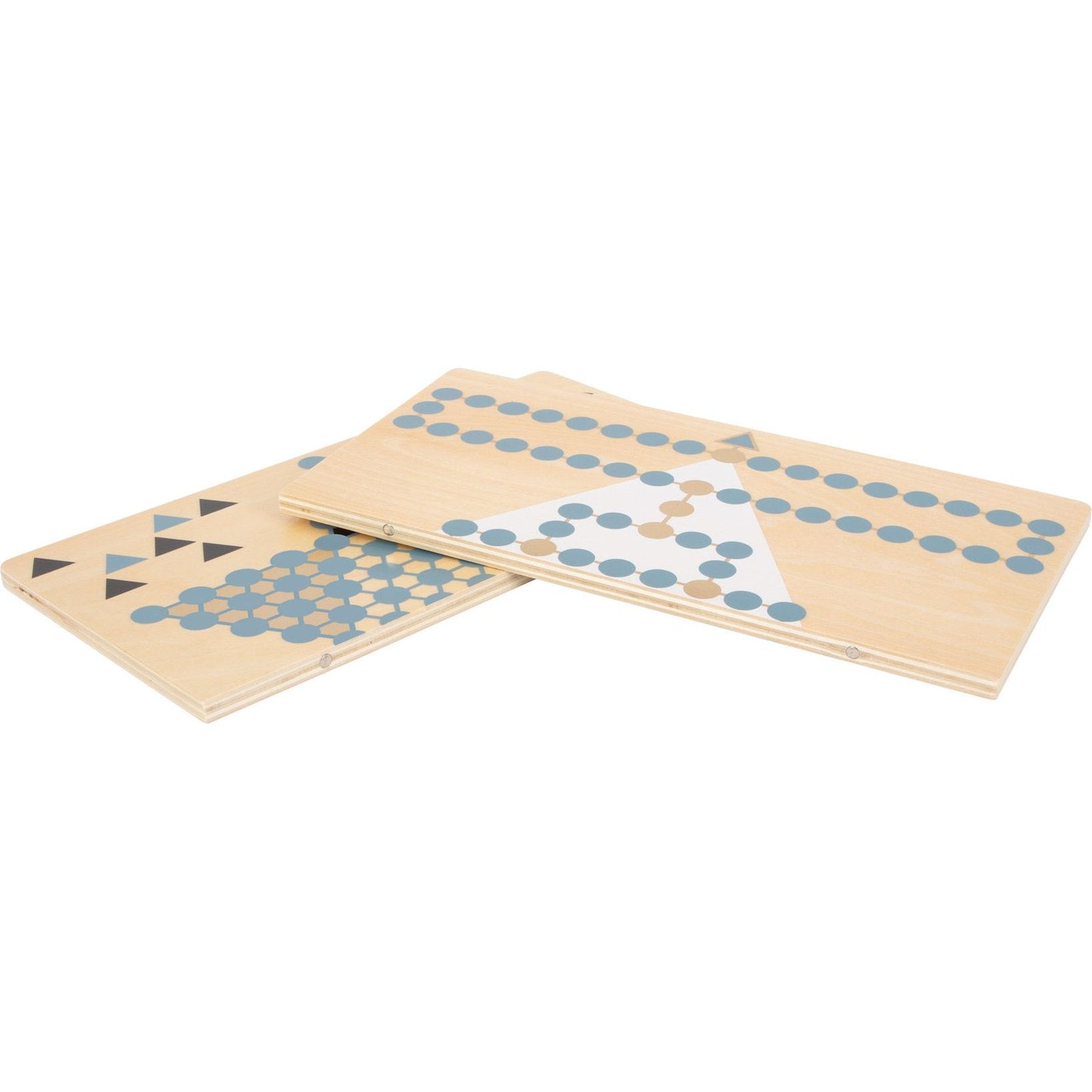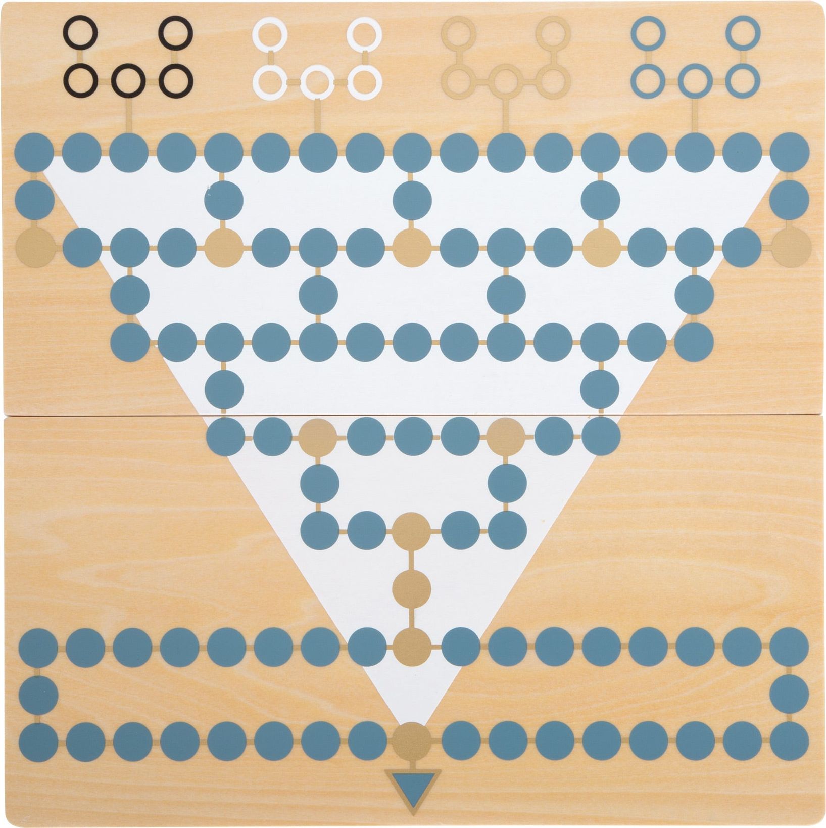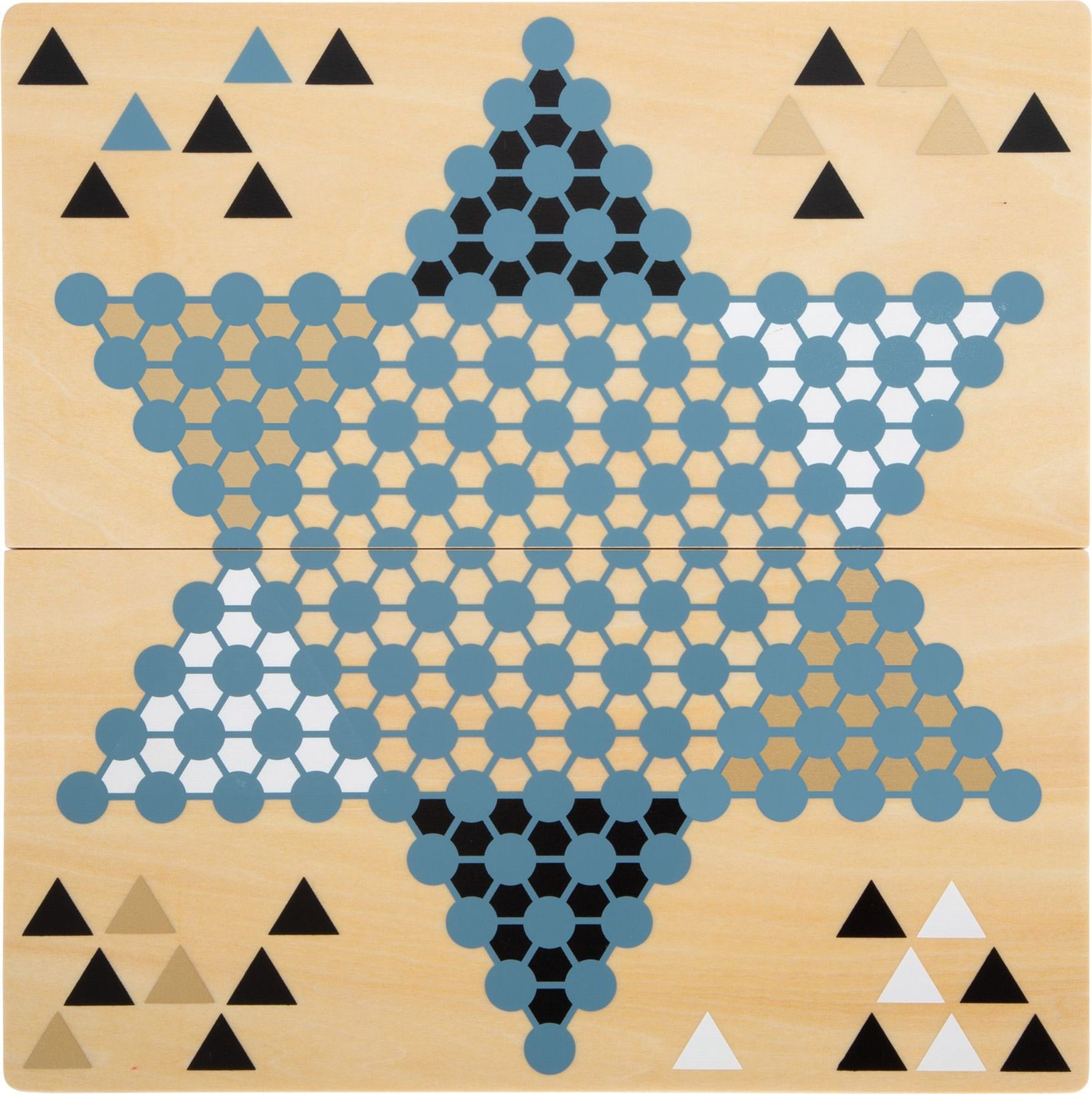 Dieses 2-in-1 Brettspiel überzeugt optisch durch trendige Gold-Akzente, modernes Rauchblau in Kombination mit schlichtem Schwarz/Weiß und viel sichtbarem Holz. Das mit klassischem Halma auf der einen und Barrikade auf der anderen Seite bedruckte Spielbrett aus stabilem Holz sorgt nicht nur für doppeltes Spielvergnügen - es ist auch zweigeteilt und somit platzsparend verstaubar! Eingelassene Magnete sorgen dafür, dass die Spielbretthälften fest beieinander bleiben. Mit hochwertigem Spielkarton zur Aufbewahrung. Taktik ist gefragt! Beim Brettspiel-Klassiker Barrikade gilt es, Sperren zu errichten, Gegner hinauszuwerfen und den strategisch besten Weg zum Ziel zu finden, obwohl Mitspieler den Pfad ins Ziel blockieren! Sternhalma, auch Chinese Checkers genannt, ist besonders leicht erlernbar und macht immer viel Freude – ob mit einer geselligen Runde unter Freunden oder gemütlich mit der Familie. Die Halmasteine kommen gleich zweifach zum Einsatz und werden auch als Barrikaden für das Barrikade-Spiel genutzt!