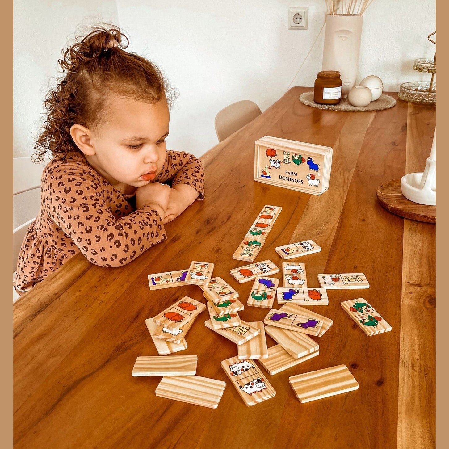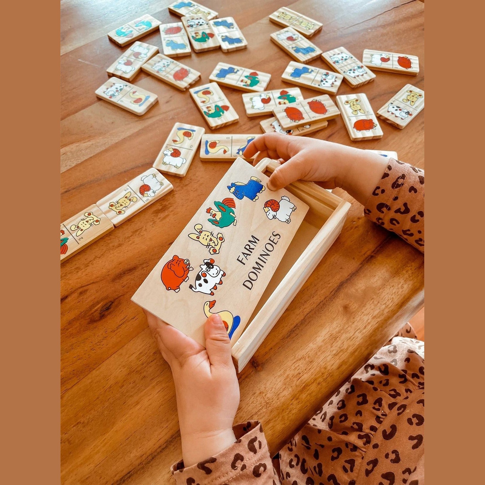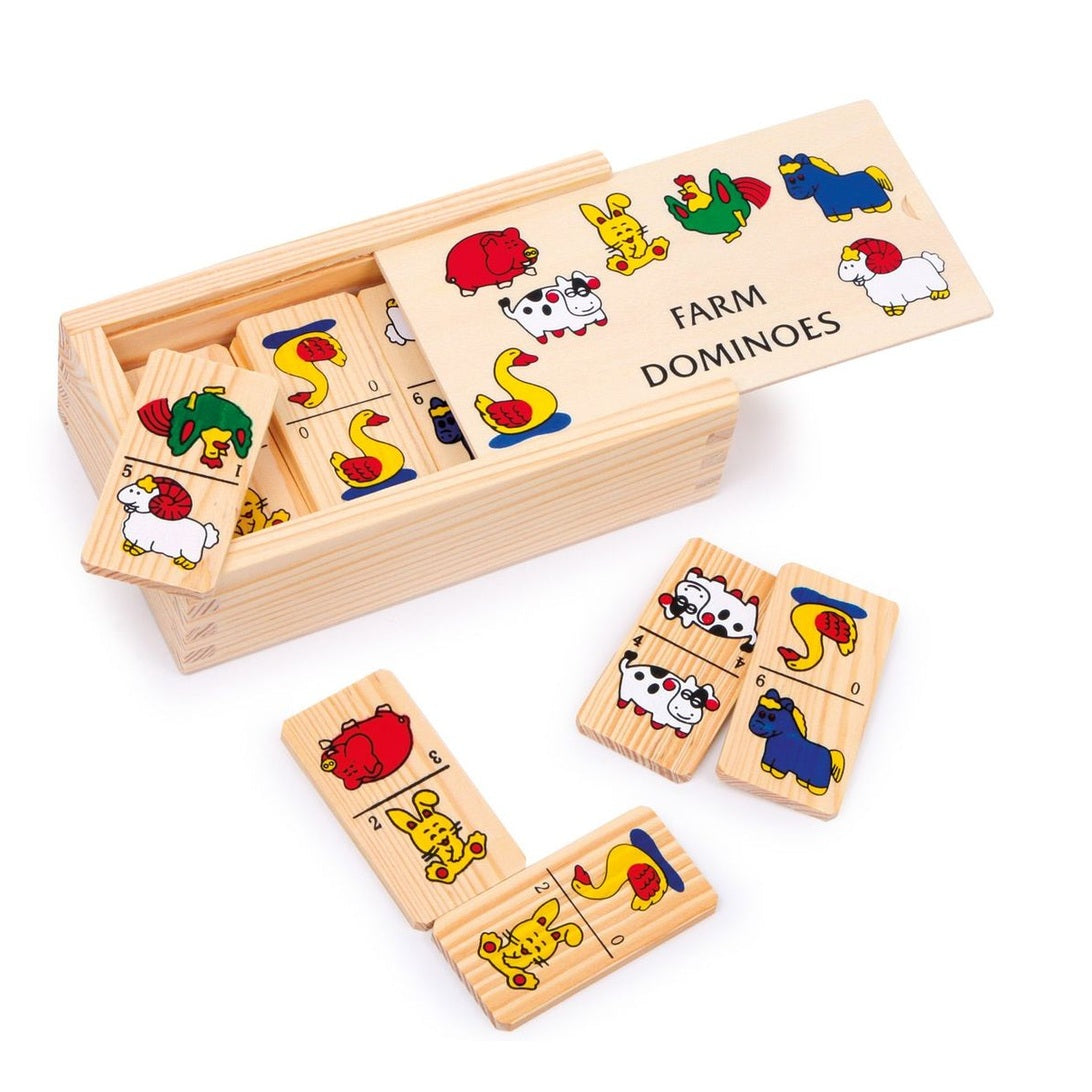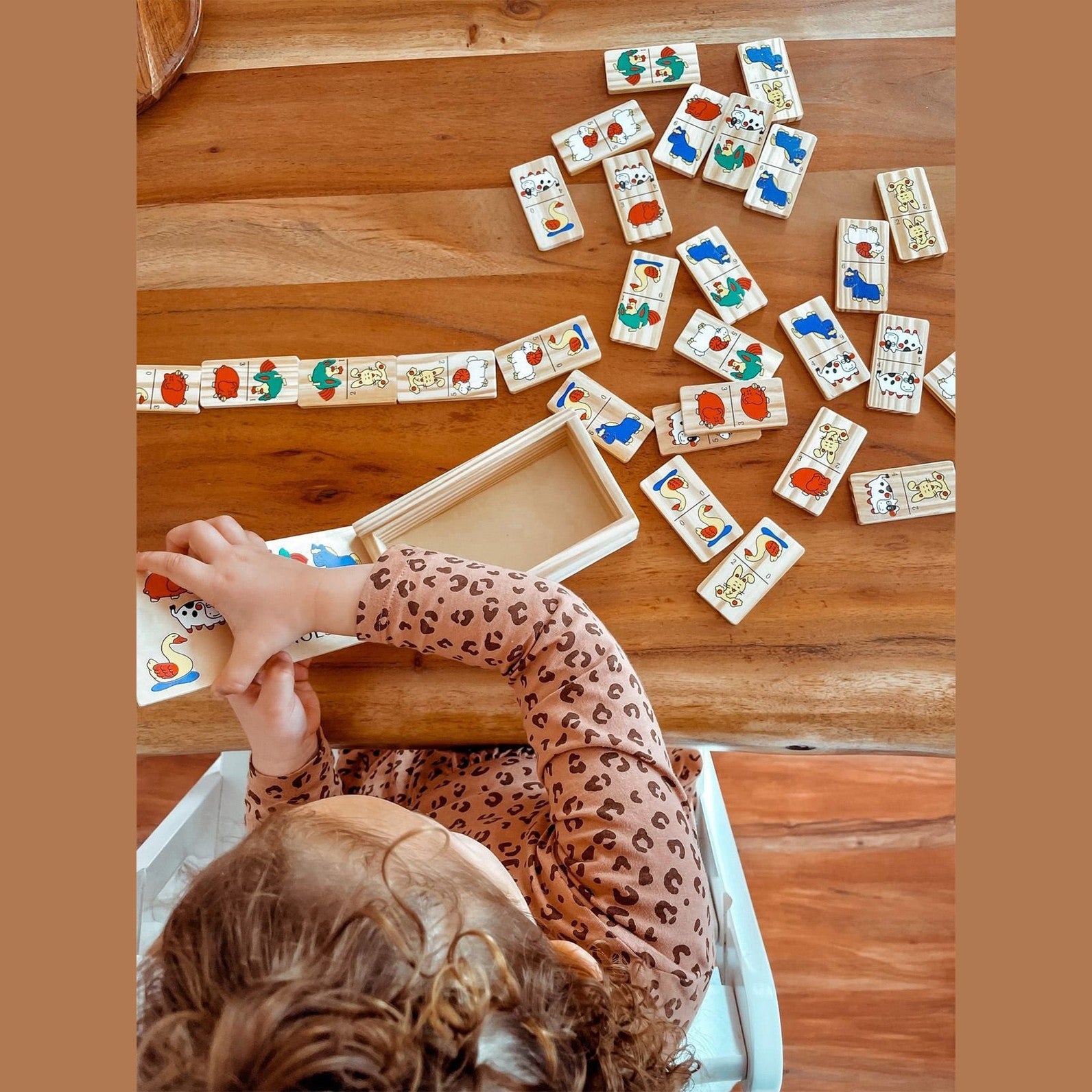 Wer schafft es, alle Motive loszuwerden? Lustige Tiermotive möchten zu ihren bildlichen Partnern. Die Dominosteine aus Holz lassen sich gut greifen und schulen ganz spielerisch die Feinmotorik. Mit Holzbox. Der Klassiker mit niedlichen Tiermotiven.