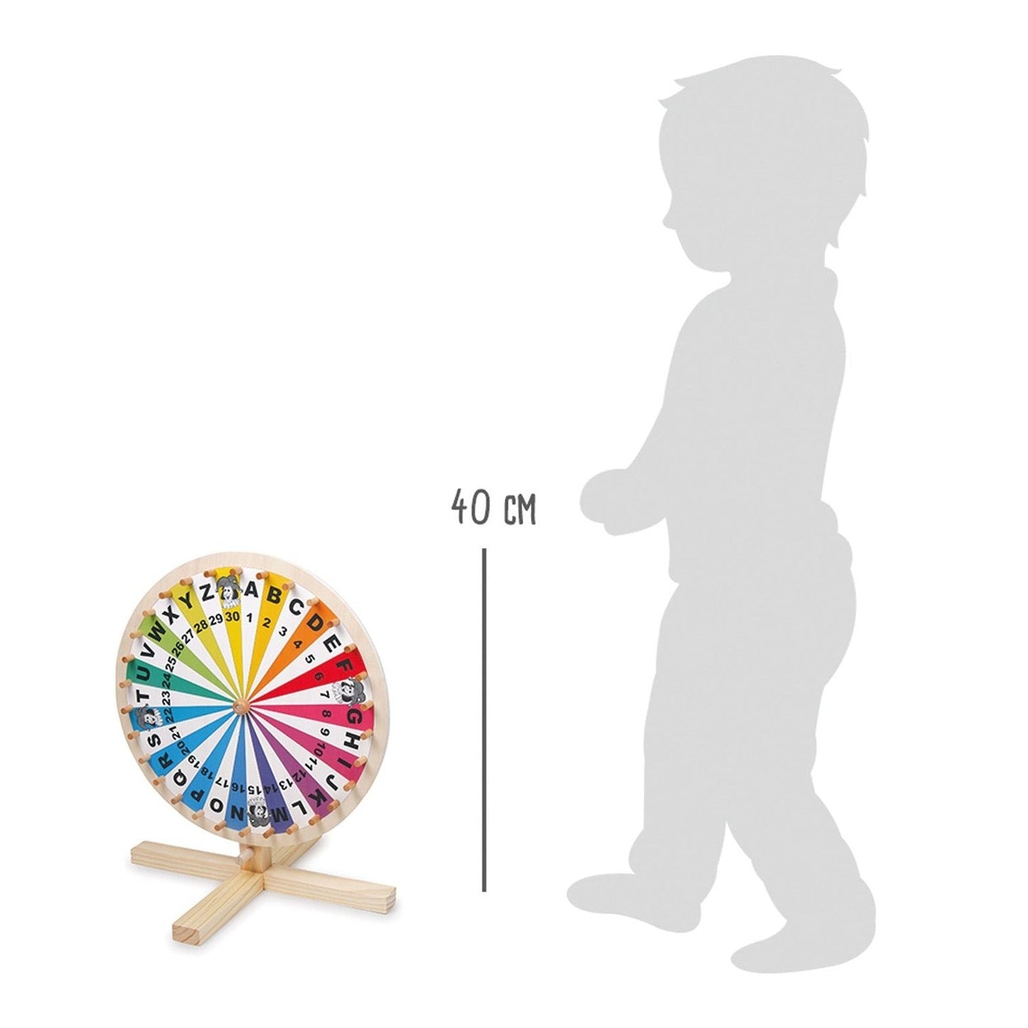 Ein tolles Zubehör für Lotteriespiele, Wortspiele oder erdachte Spiele ist dieses Glücksrad mit Ziffern von 1 bis 30, Buchstaben von A bis Z und vier Jokern! Auf dem standsicheren Massivholzständer kann das Rad sich gut drehen und die einzelnen Felder sind mit Holzstiften versehen, welche fröhlich an dem „Stopper“ klappern.