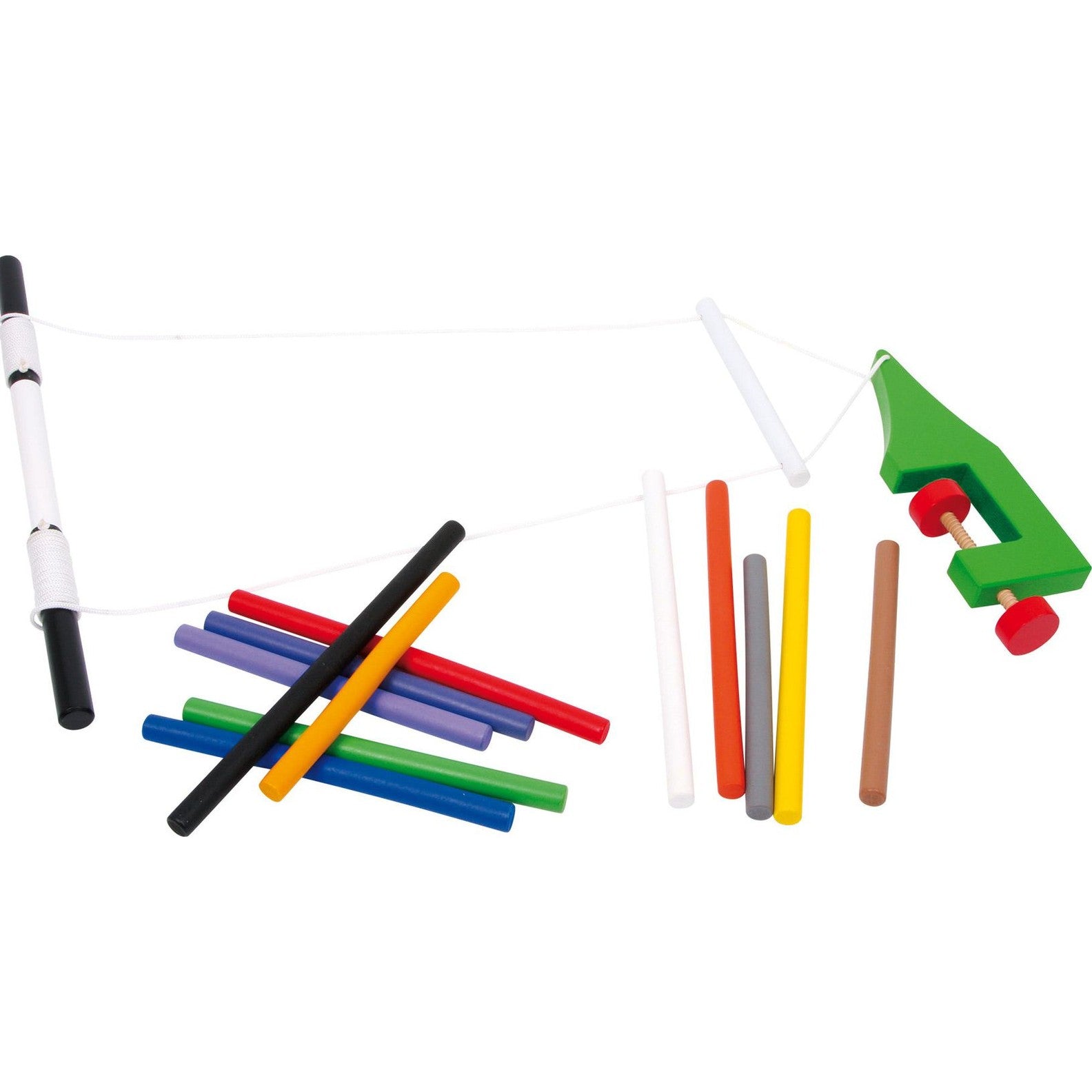 Einfach die Holzzwinge am Tisch befestigen, Bänder stramm halten und dann sind Geschicklichkeit und Nervenstärke gefragt. Denn nur wer eine ruhige Hand hat, kann die bunten Rundhölzer über die sich verbreiternde Strecke balancieren lassen!
