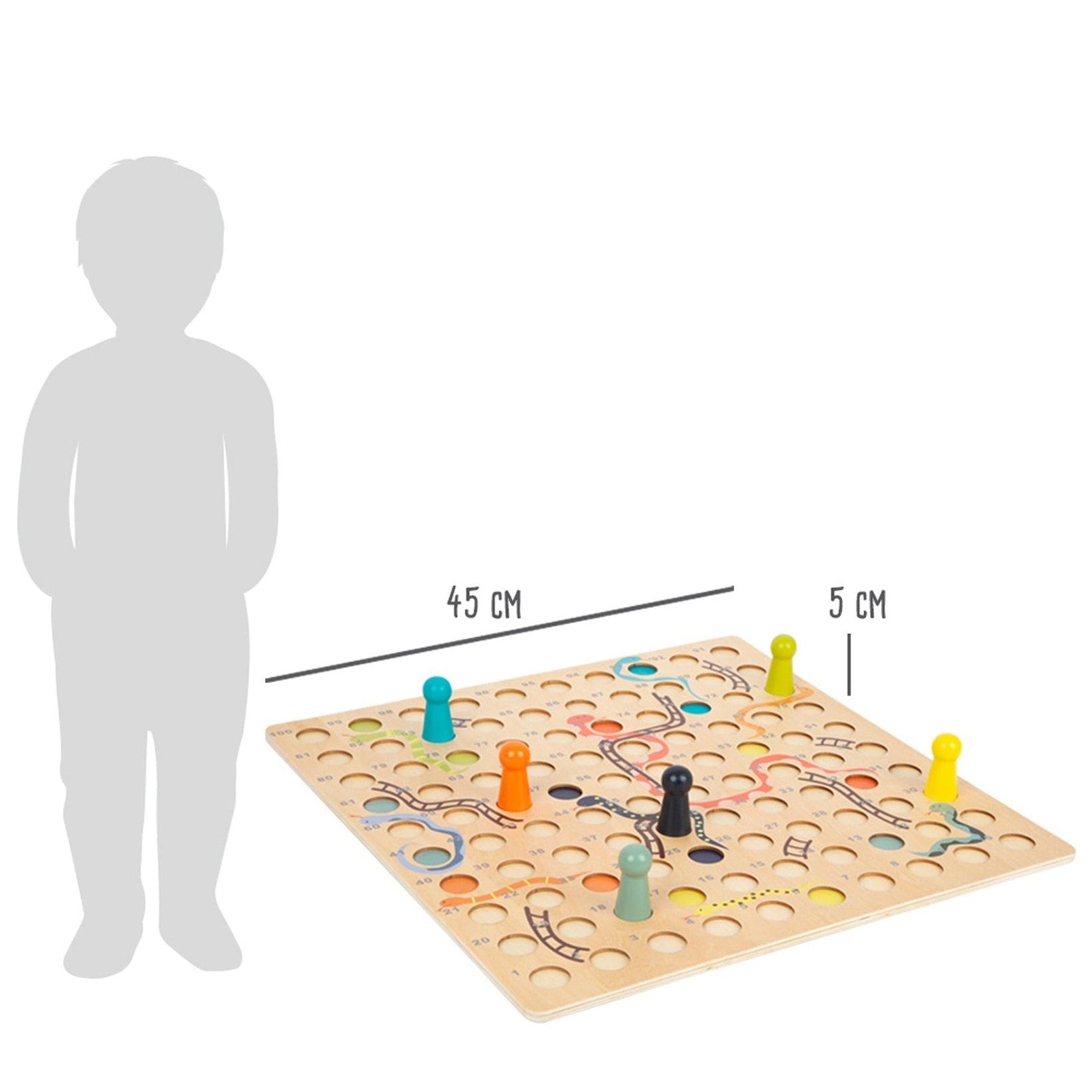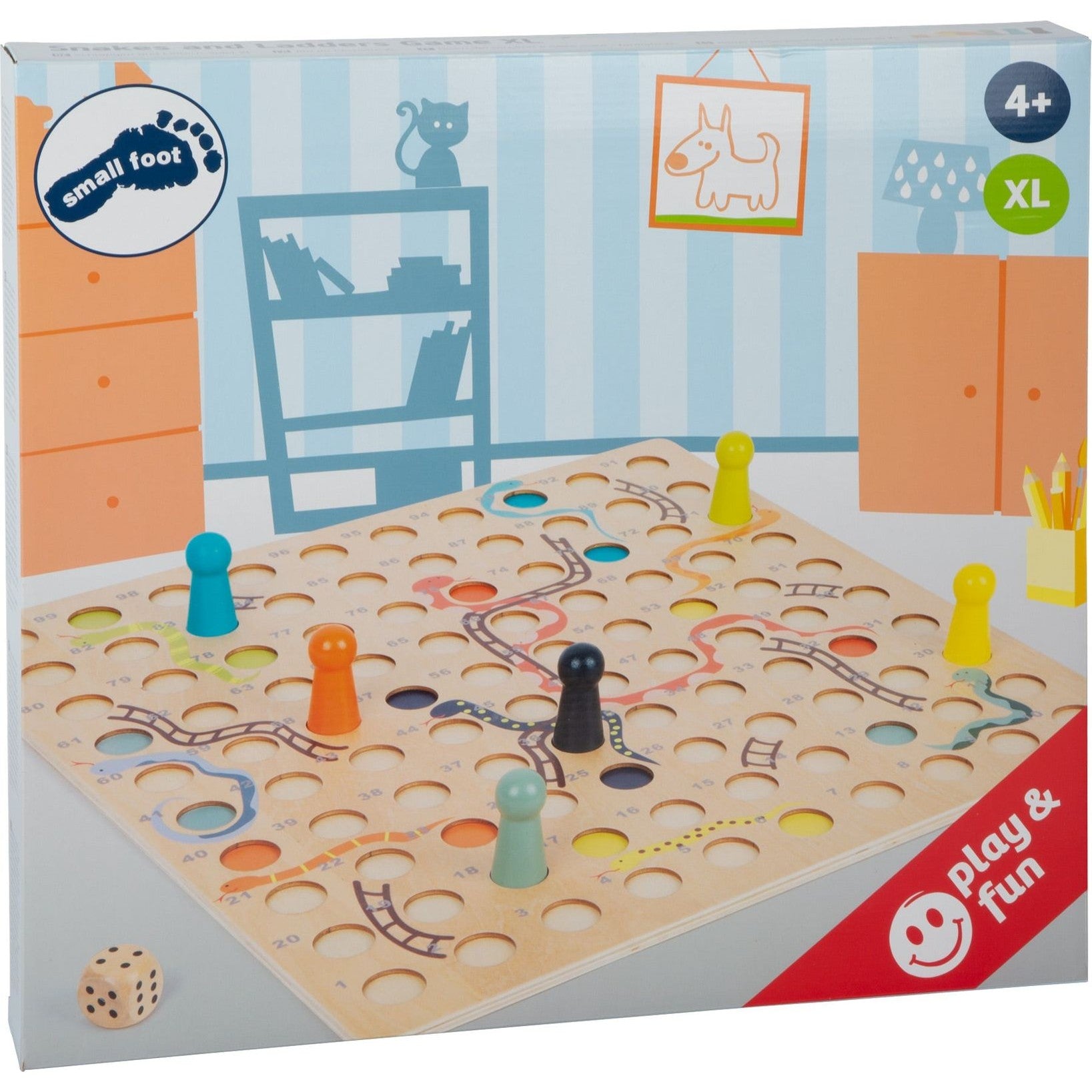 Leiterspiel im Großformat! Bei diesem Brettspiel-Klassiker gilt es, möglichst viele Leitern hochzuklettern, um als erster das 100. Feld zu erreichen. Doch Achtung: Kommt ein Spieler auf ein Schlangen-Feld, rutscht er wieder nach unten! Das extra große Spielfeld, die XL-Spielfiguren und die runden Aussparungen machen das Spiel perfekt geeignet für Spieler mit kleinen Händen oder unsicherer Handführung. Mit Stoffbeutel. Ein spannendes Gesellschaftsspiel für bis zu sechs Spieler, das Nervenkitzel garantiert! Der Würfel und die 6 Spielfiguren können im mitgelieferten Stoffbeutel sicher verstaut werden. Riesen Spaß für Kinder, Eltern und Großeltern!