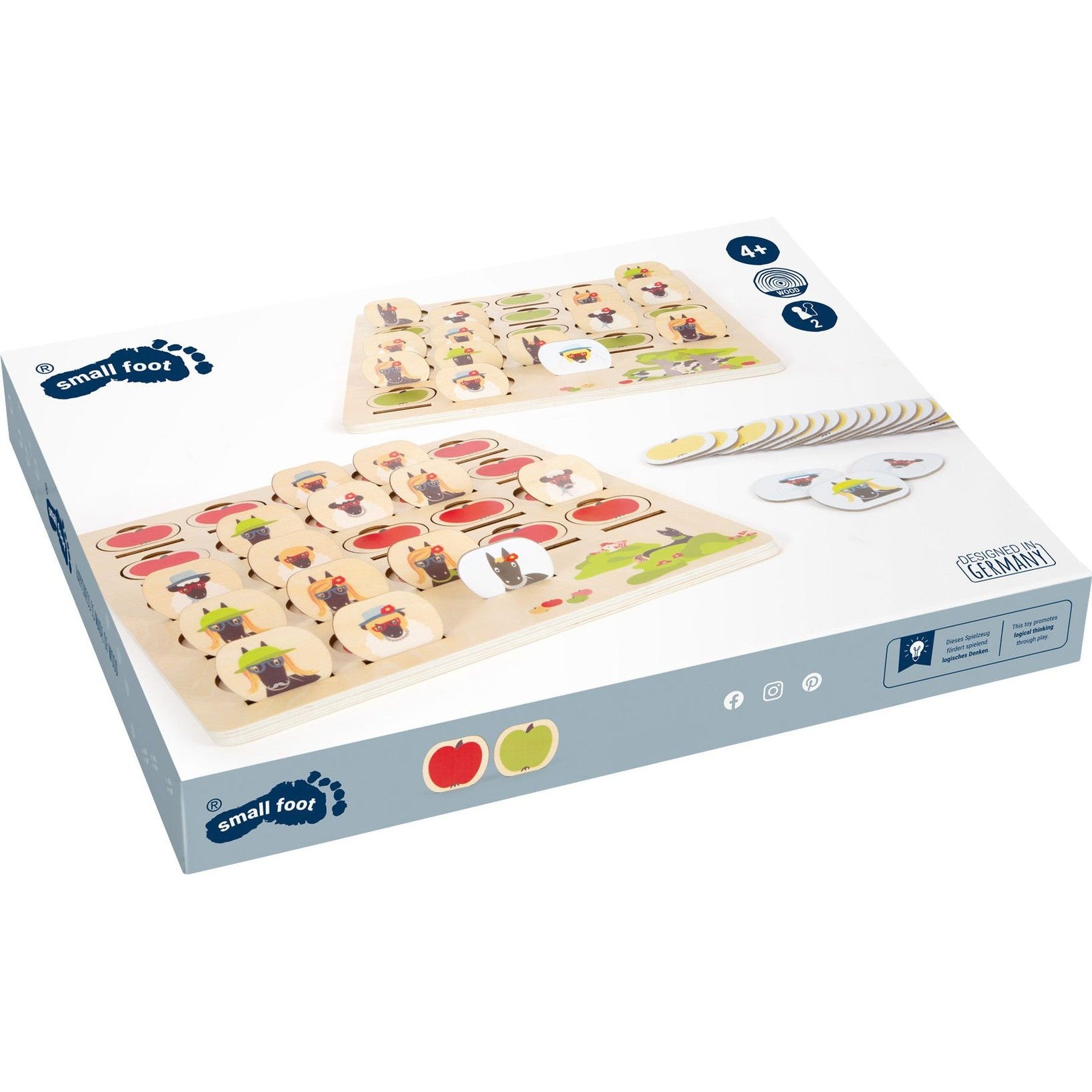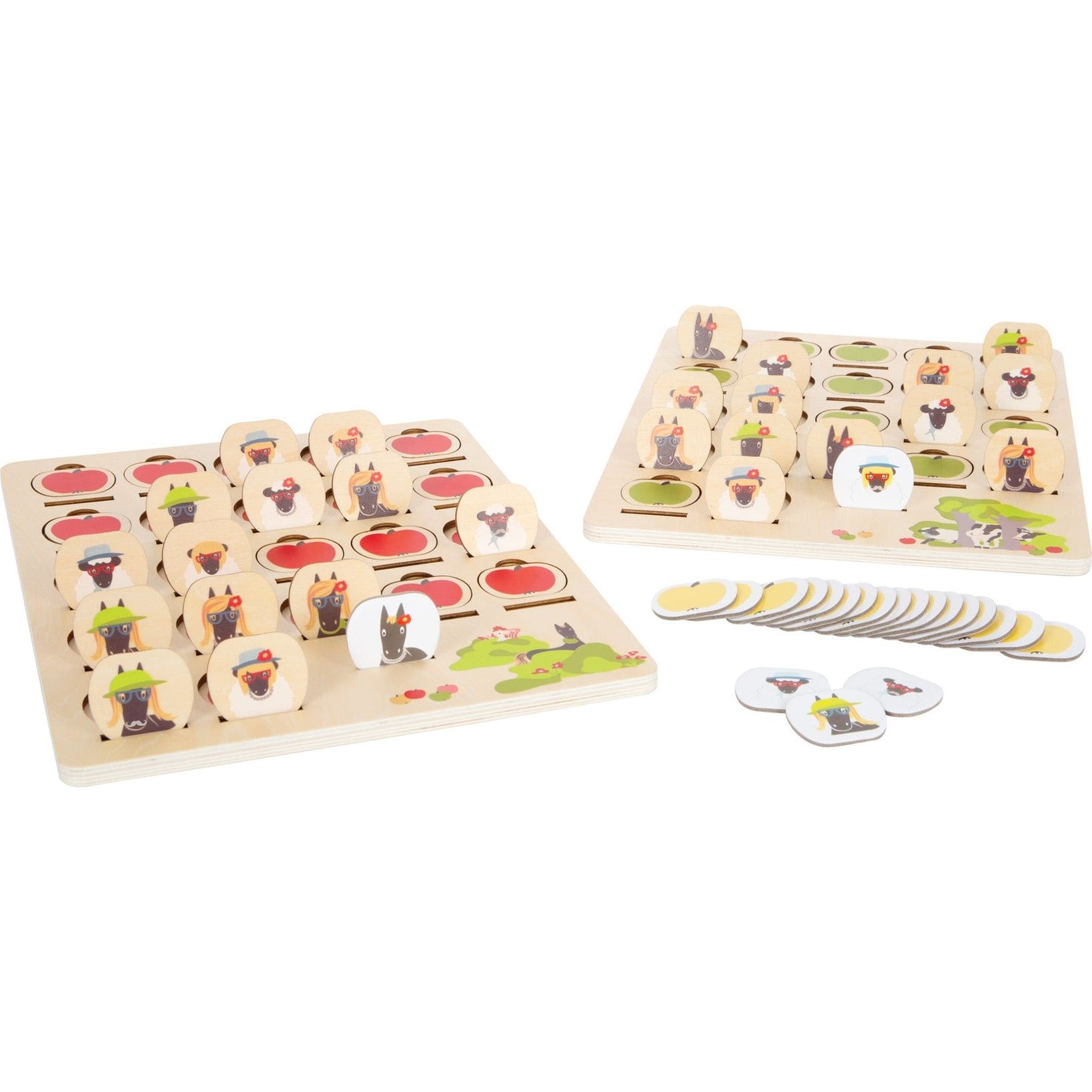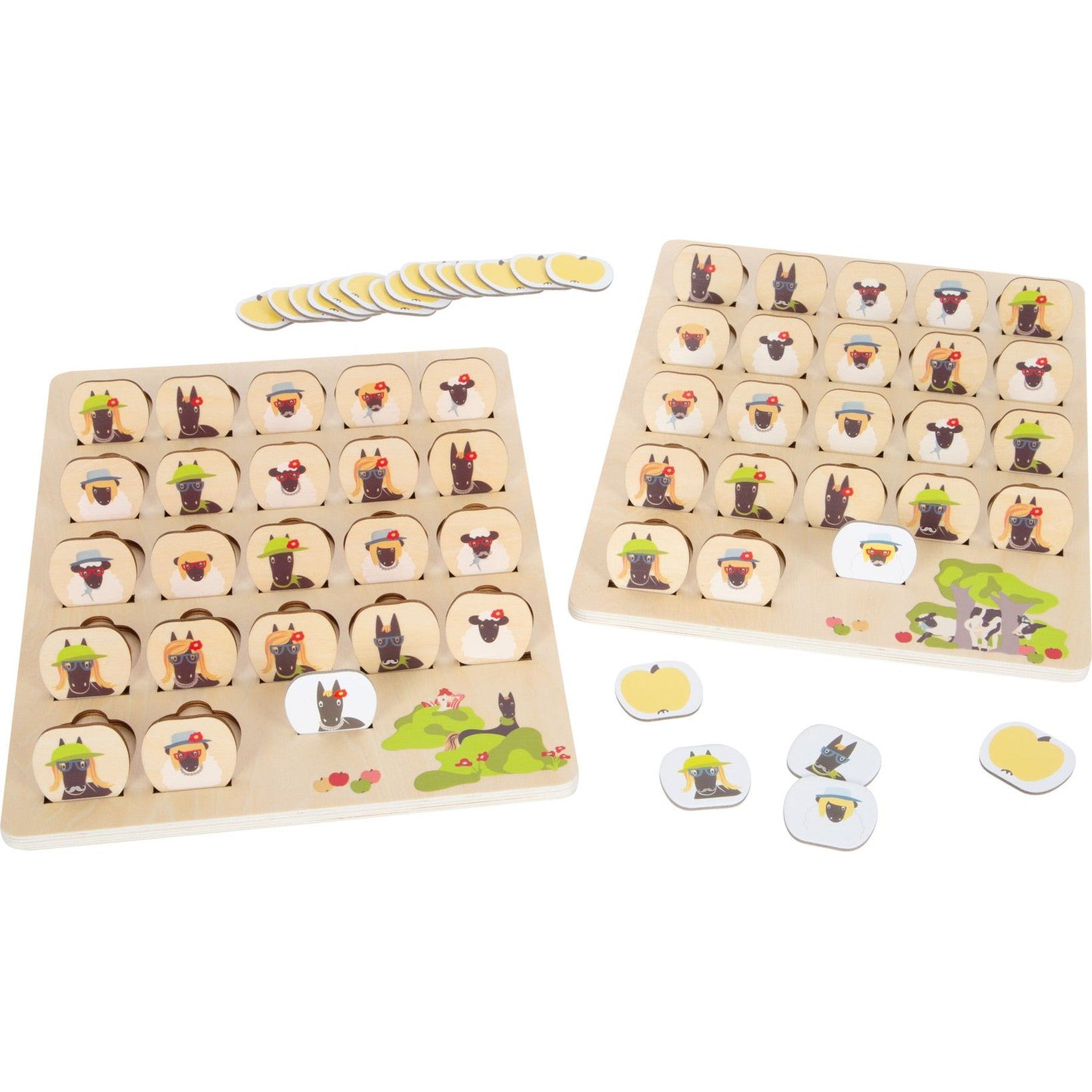 Wer hat die Äpfel gemopst? Bei dem beliebten Ratespiel für die ganze Familie ist eine gute Beobachtungsgabe wichtig, denn es gilt, mit geschickten Fragen die gesuchte Figur der „4 Friends“ schnell zu erkennen! Ein Spieleklassiker aus robustem Holz in besonders kindgerechtem Design! Mit zwei Spielbrettern zum Aufstellen der Rate-Plättchen und 22 Pappkarten zum Ziehen der zu erratenden Figur. 2-in-1: Das Knobelspiel ist auch als klassisches Memo zu verwenden! Mit hochwertigem Spielkarton zur Aufbewahrung. Olga die Kuh und Heinz der Hahn versuchen zu erraten, wer die Äpfel von der Weide stibitzt hat. Doch die beiden Verdächtigen haben sich zur Tarnung gut verkleidet! Das beliebte Fragespiel eignet sich ideal dazu, um mit Kindern das Thema Gemeinsamkeiten und Unterschiede spielerisch zu erörtern. Das Gesellschaftsspiel mit seinen sehr einfachen Spielregeln begeistert Klein und Groß gleichermaßen bei schnellen Spielrunden und fördert nebenbei Kombinationsfähigkeit sowie Konzentration.
