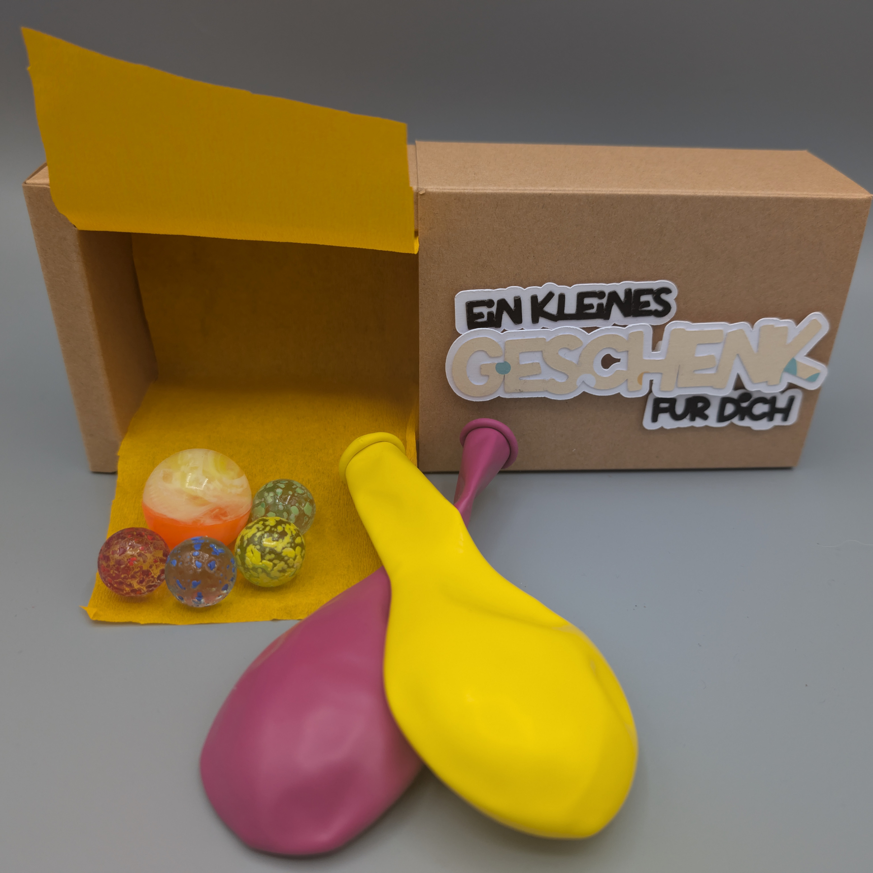 Die Geschenkbox – Klein ist das perfekte Giveaway oder Geschenk für kleine Glücksmomente. Sie enthält bunte Luftballons, schillernde Murmeln und einen kleinen Flummy – alle liebevoll verpackt in einer Box, deren Verzierung du in deiner Lieblingsfarbe wählen kannst. Zusätzlich kannst du einen weiteren Artikel deiner Wahl hinzufügen, um die Überraschung noch persönlicher zu machen. Einfach spielen, staunen und Freude verschenken!